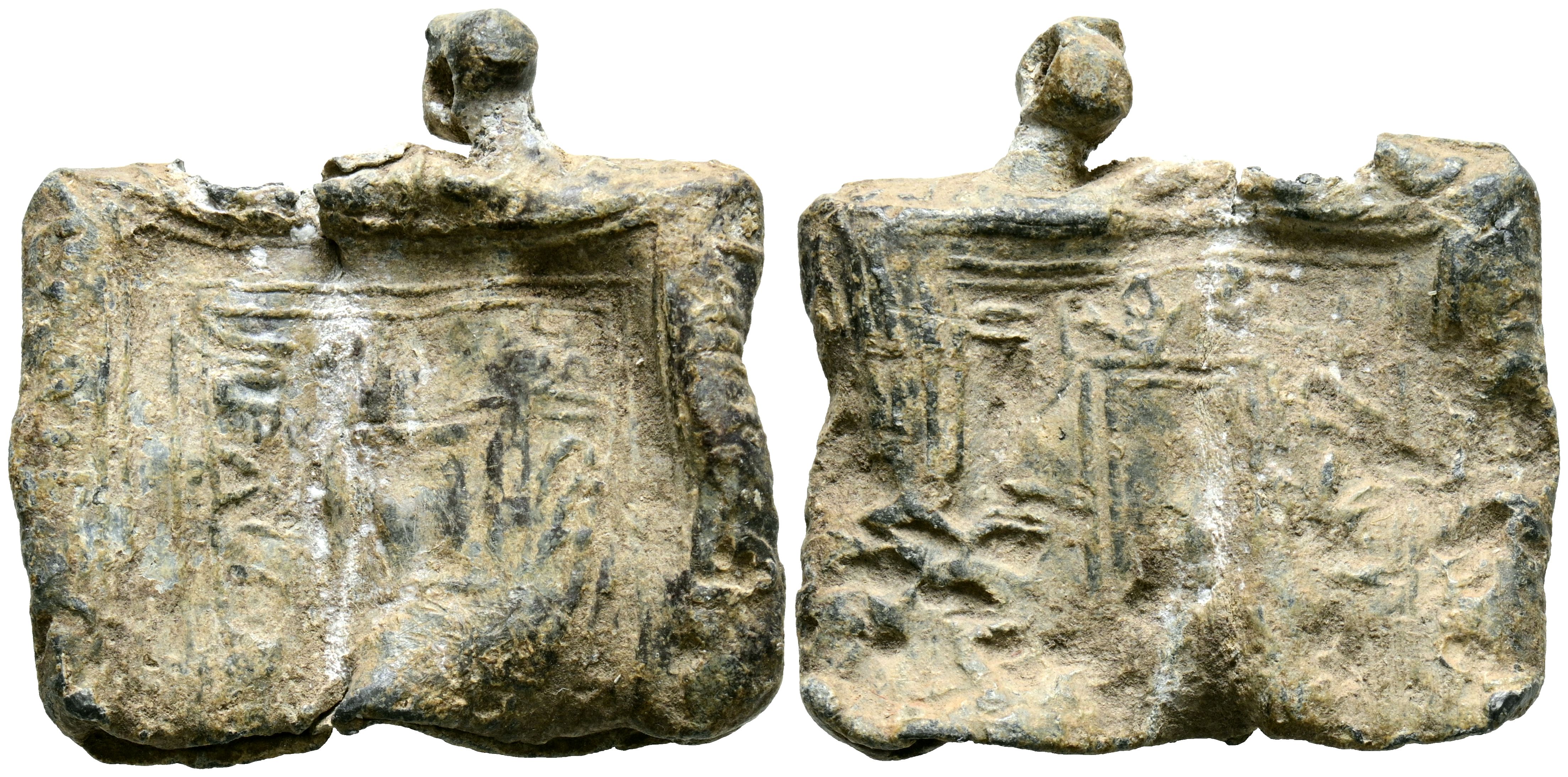 TAIFAS PERIOD. Amulet-case. (Pb. 12.67g/31x30mm). Possibly 11th century. Rectangular lead case with an opening at the bottom, a suspension ring and another remains at the top. Both areas are bordered by an epigraphic band in simple Kufic that frames a small central cartouche, which on one side is rectangular and on the other, draws a practically clear square. The piece has a pronounced vertical mark on both sides, probably due to a fold. (Amulets Type-Boxes A-III). Almost Very Fine.