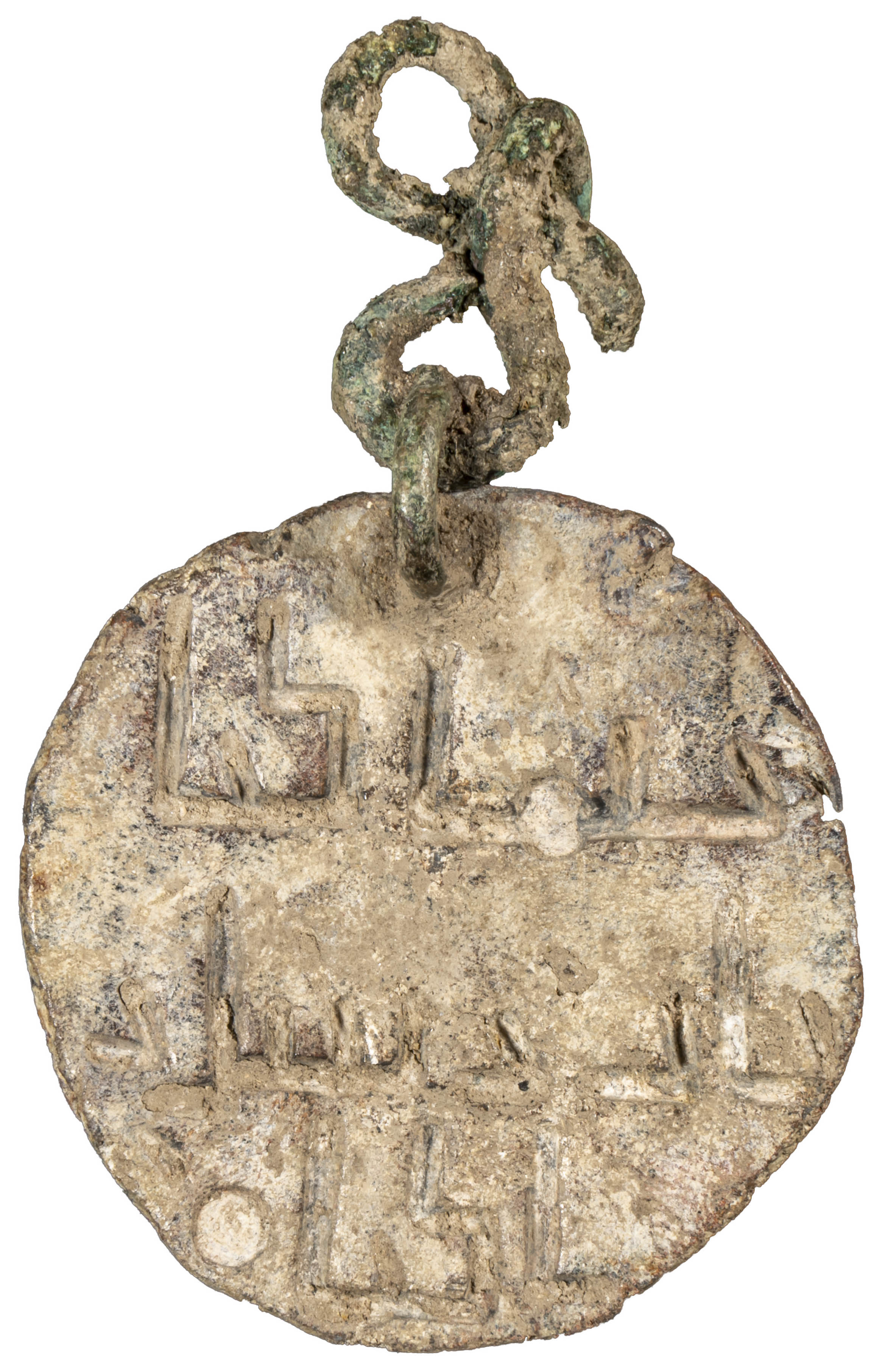 NORTH AFRICAN. Amulet-token. (Pb. 65.10g/55x53mm-with chain 83mm). Circular lead plate crossed by a fastening ring at the top, from which two chain links attach. Anv: Legend in three lines of incised and simple linear Kufic writing. Rev: Anepigraph. (Amulets 331. Card type, same copy). Good Very Fine. Very interesting for study.