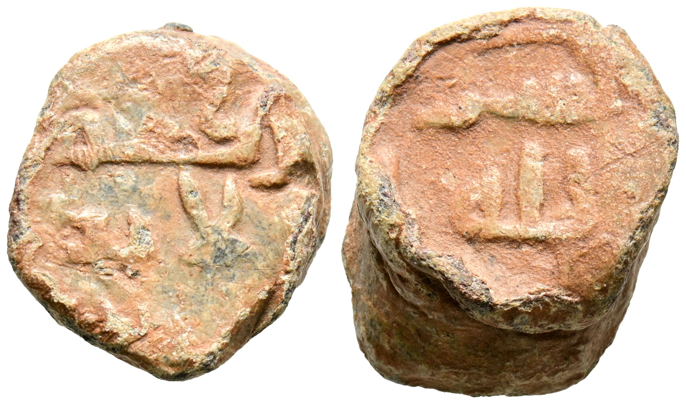 English PERIOD OF CONQUEST. Loot Seal/Seal. (Pb. 11.80g/16x7mm). 711-756 AD Anv: Divided into two lines: بسم / الله = bismi-llāh. (In the name of God) Rev., in three lines: (مـ)ن؟ قسم / (ا)لانـد / (لس)؟ = min gism al-Andalus (From the distribution of a l-Andalus). (Senac/Ibrahim 2017-Type 56, same copy). Good Very Fine. Rare and very interesting specimen.