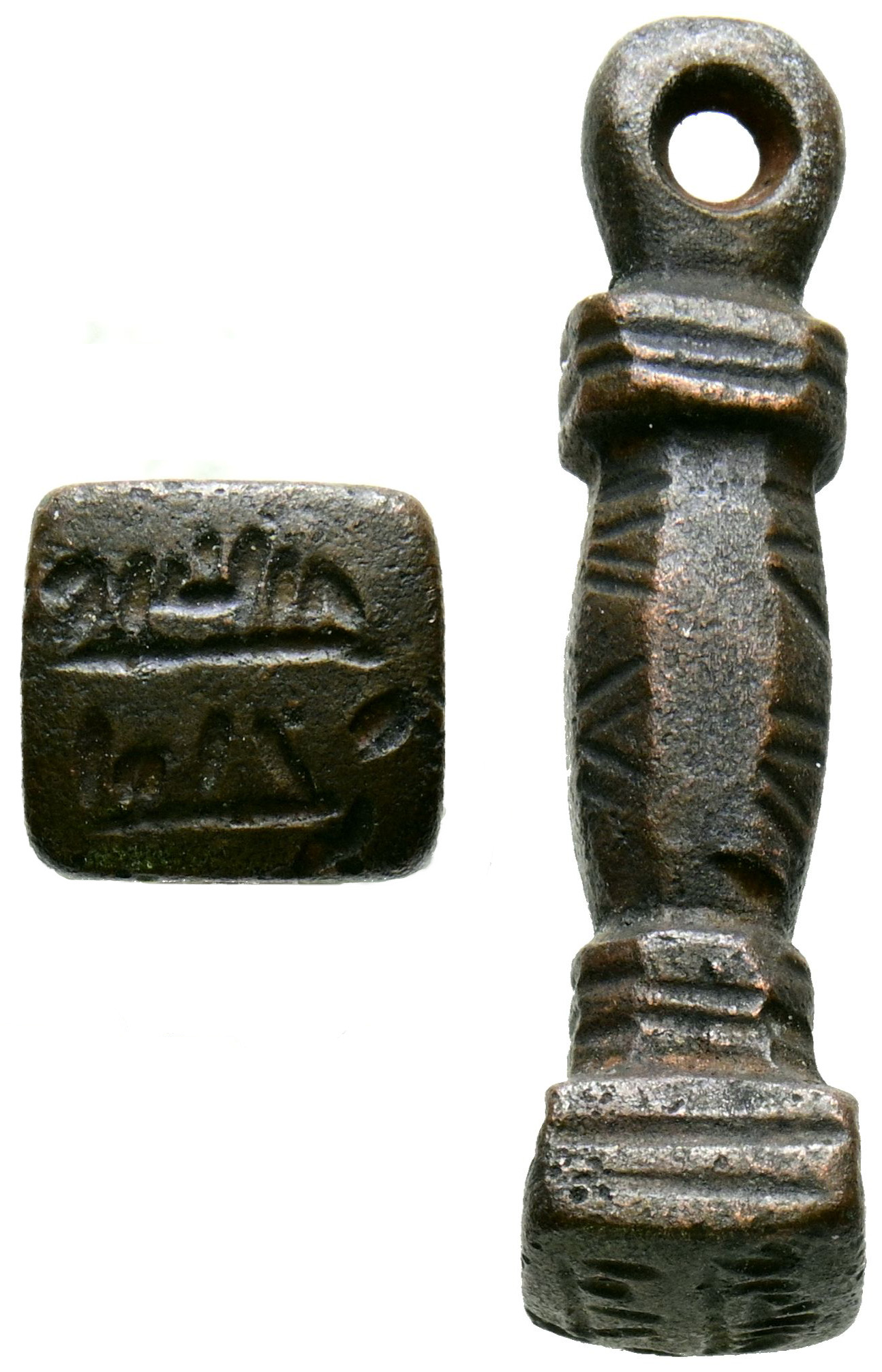 CALIFAL OR TAIFAS PERIOD. Matrix for wax or sealing seal. (Ae. 5.35g/28x7X8mm.) Possibly 10th-11th century. Quadrangular, with an elegant column-shaped body and a suspension ring at the top. Legend in two lines made in simple Kufic and deep lines: عبدته / ا فلع (His servant / Afla'). (Piece published in Manquso Nº8, page 71 by Sebastián Gaspariño and Tawfiq Ibrahim). Very Fine.