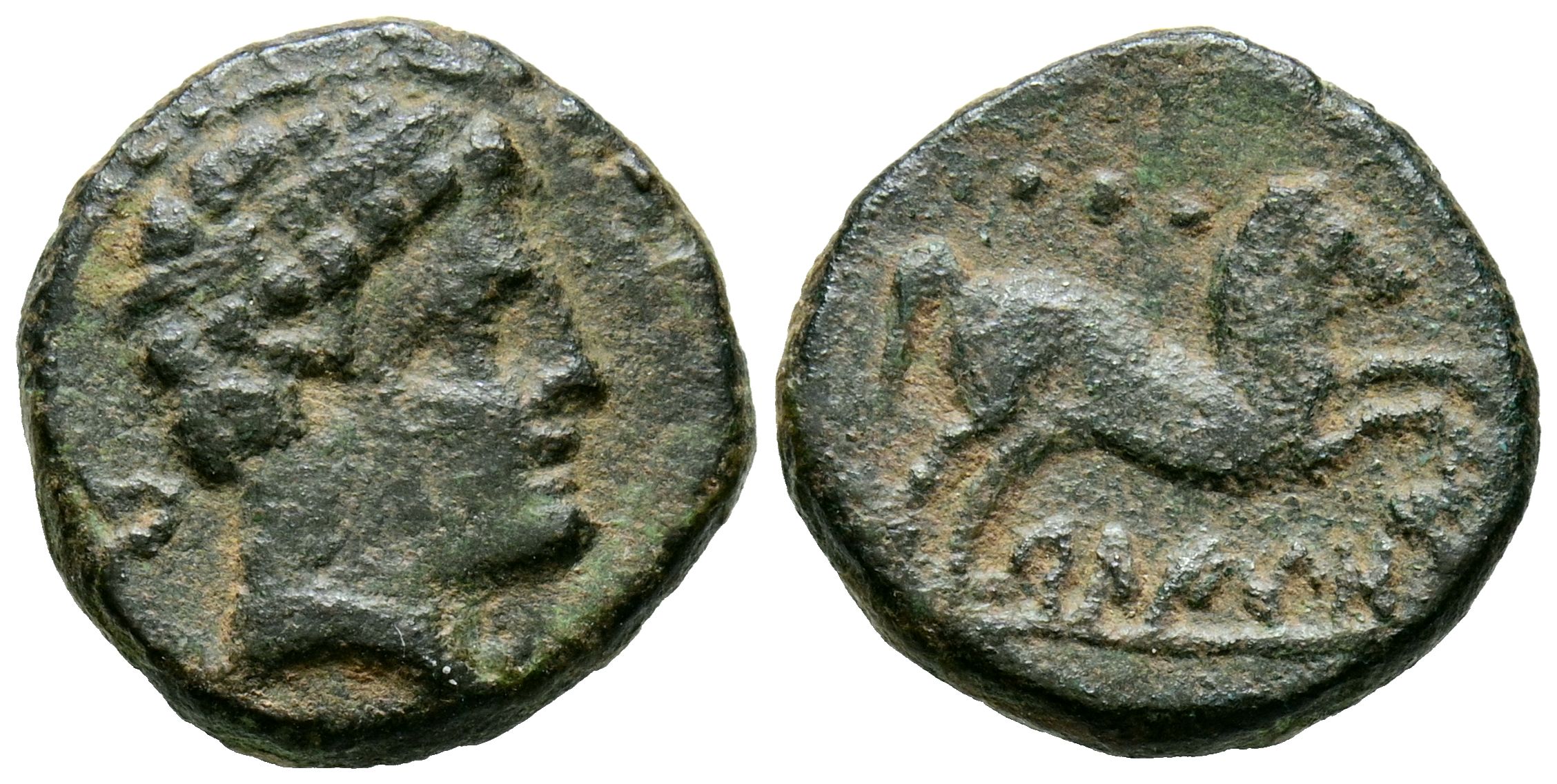 BELIGIOM (Belchite, Zaragoza). Quadrant. (Ae. 3.48g/16mm). 180-20 BC (FAB-247). Anv: Diademed head on the right, behind Iberian letter Be. Rev: Horse jumping to the right, above three points and below Iberian legend: BELIGio. Almost Extremely Fine.