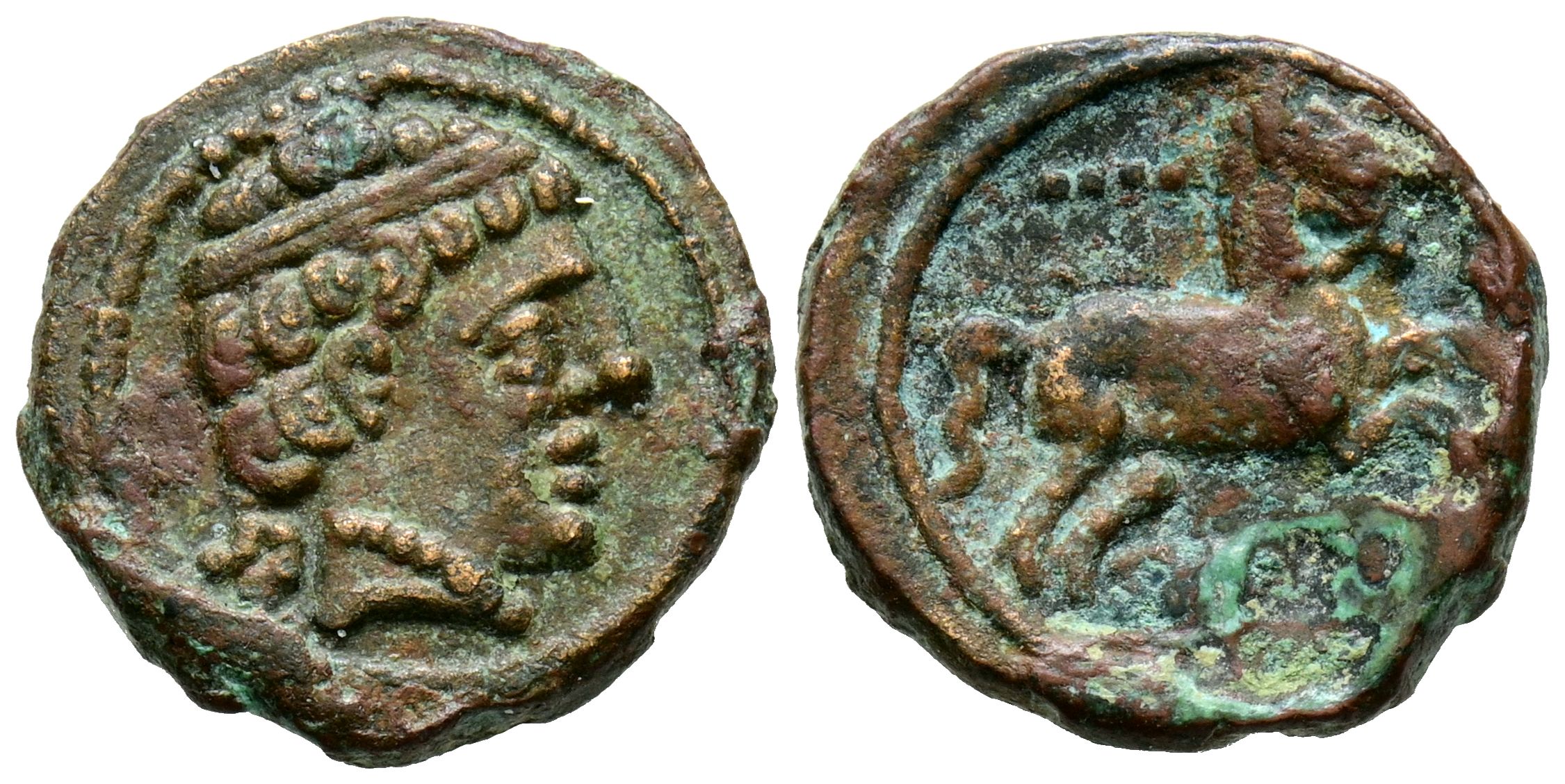 BELIGIOM (Belchite, Zaragoza). Quadrant. (Ae. 2.43g/16mm). 120-20 BC (FAB-248). Anv: Bearded male head on the right, behind Iberian letter: Be. Rev: Horse jumping to the right, above three points, below Iberian legend: BeLIGiO. Good Very Fine/ Almost Very Fine. Oxidations.
