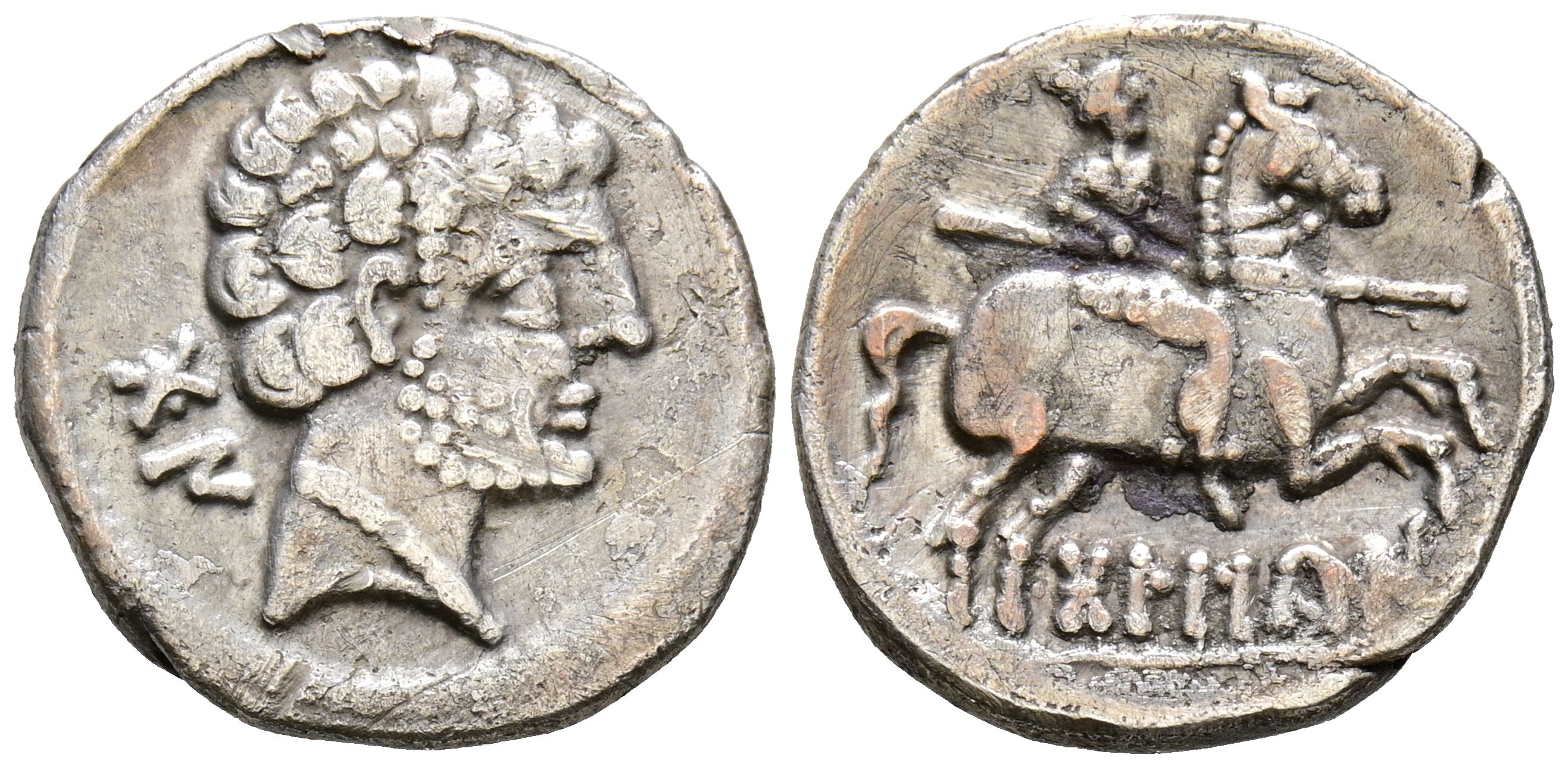 BOLSCAN (Huesca). Denarius. (Ar. 3.39g/19mm). 180-20 BC (FAB-1911). Anv: Bearded male head on the right, behind Iberian letters: BoN. Rev: Rider with lance to the right, below Iberian legend: BoLSCaN. Very Fine.
