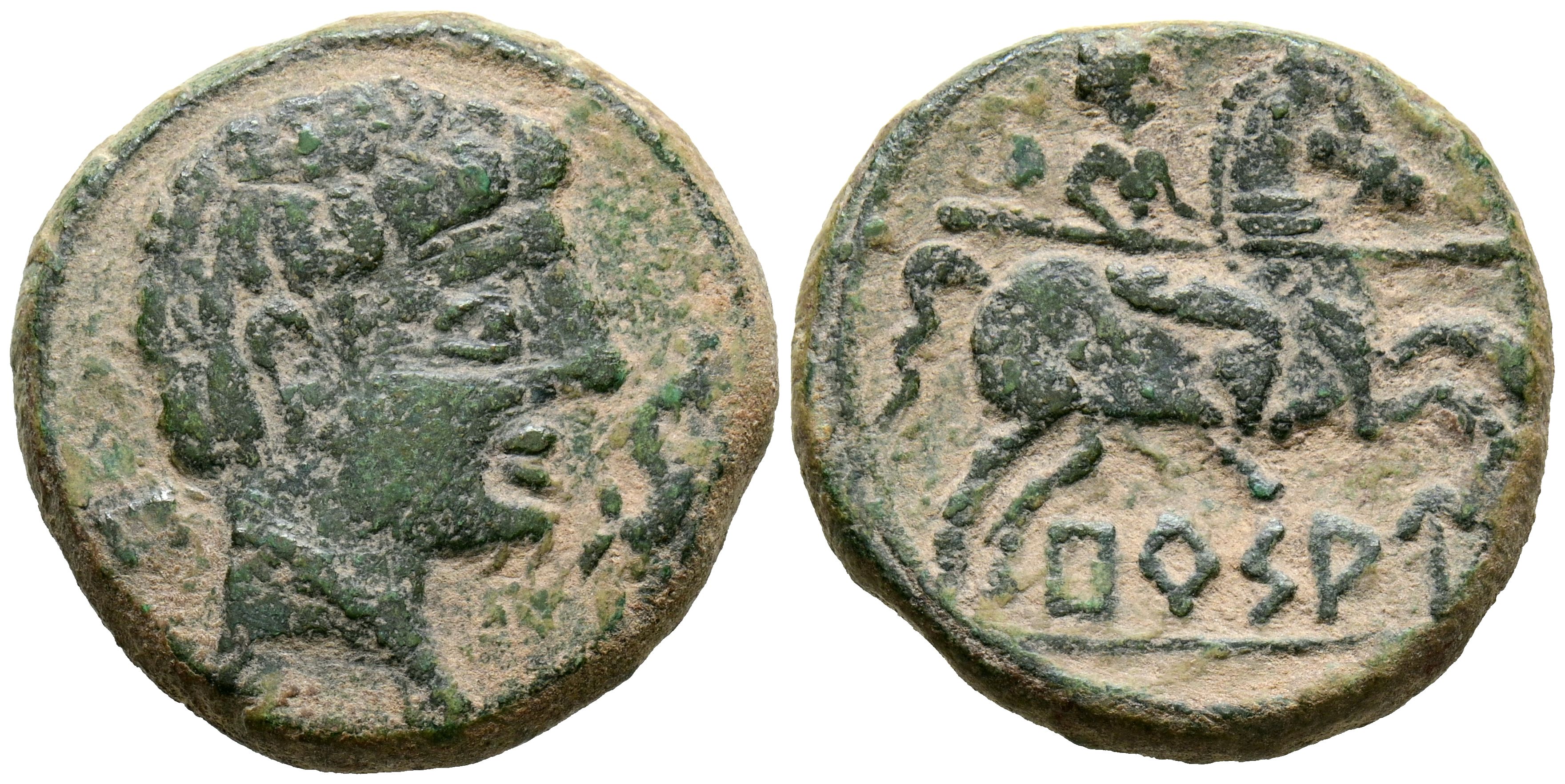 BURSAU (Borja, Zaragoza). As. (Ae. 11.79g/25mm). 120-80 BC (FAB-298). Anv: Bearded male head on the right, behind the letter Bu, in front dolphin. Rev: Rider with spear to the right, crescent above, Iberian legend below: BuRSAU. Very Fine. Scarce copy.