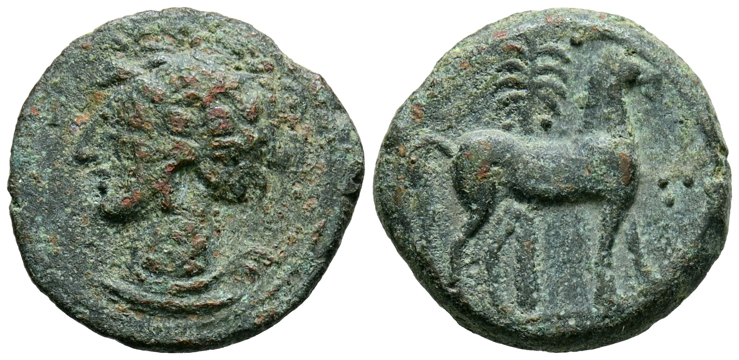CARTAGONOVA (Cartagena, Murcia). 1/2 Tracing. (Ae. 2.95g/17mm). 220-215 BC (FAB-507). Anv: Head of Tanit to the left. Rev: Horse standing on the right, palm tree behind. Very Fine.