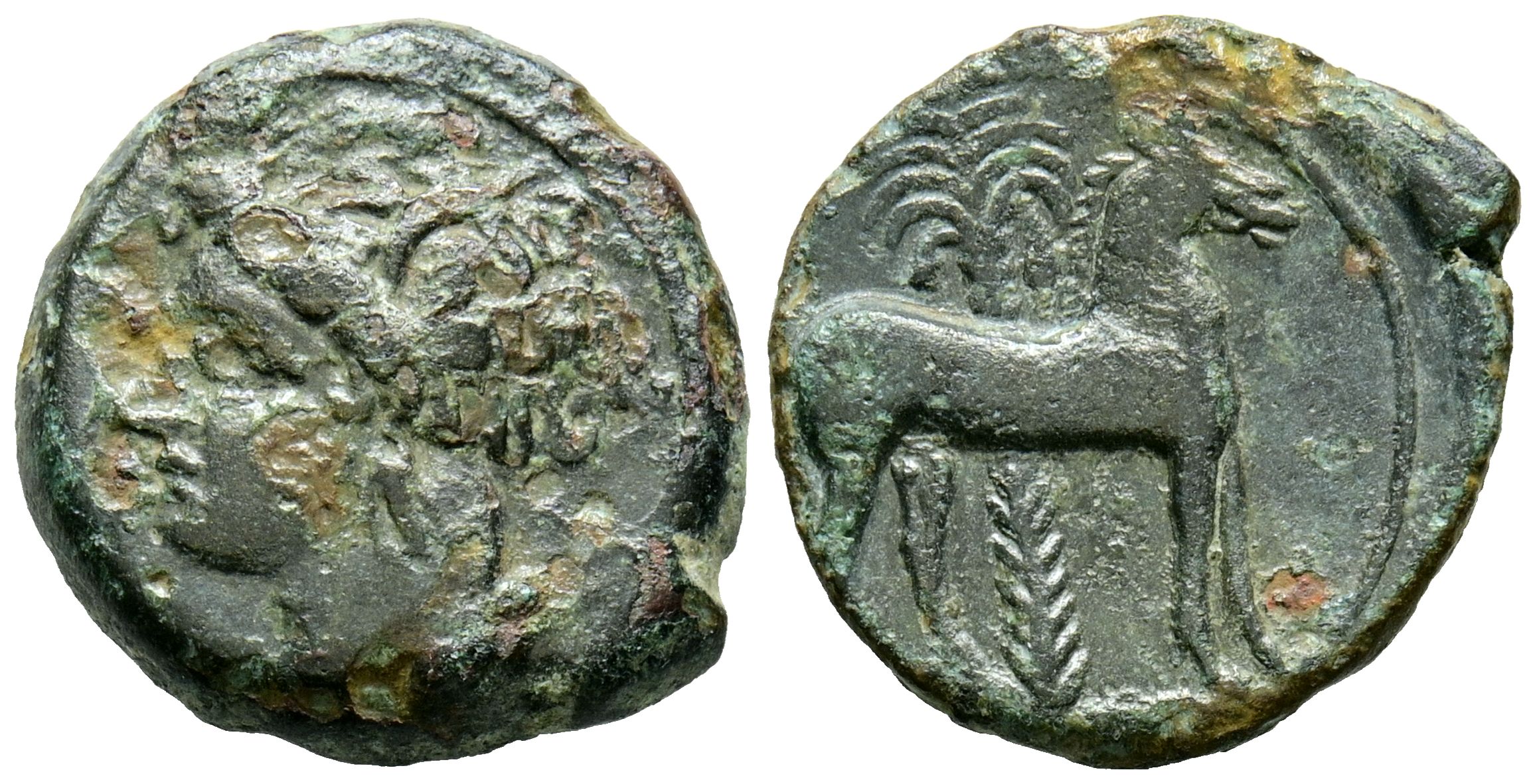 CARTAGONOVA (Cartagena, Murcia). 1/2 Tracing. (Ae. 2.58g/16mm). 220-215 BC (FAB-507var). Anv: Head of Tanit to the left. Rev: Horse standing on the right, palm tree behind. Very Fine.
