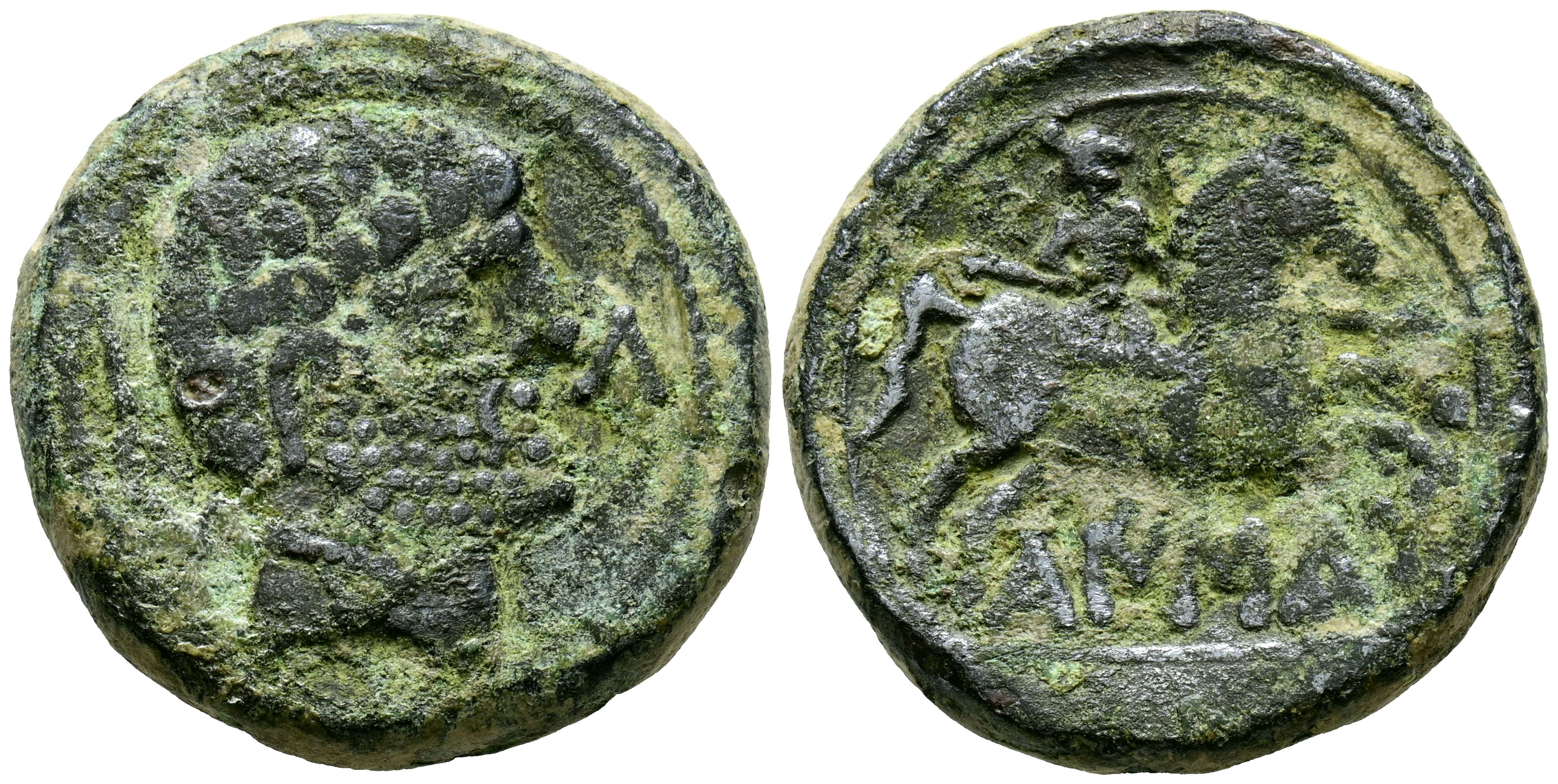 CAISCATA (Cascante, Navarra). As. (Ae. 13.93g/26mm). 120-20 BC (FAB-687). Anv: Bearded male head to the right, behind dolphin, in front Iberian letter: Ca. Rev: Horseman with spear to right, below Iberian legend: CaISCATa. Almost Very Fine.