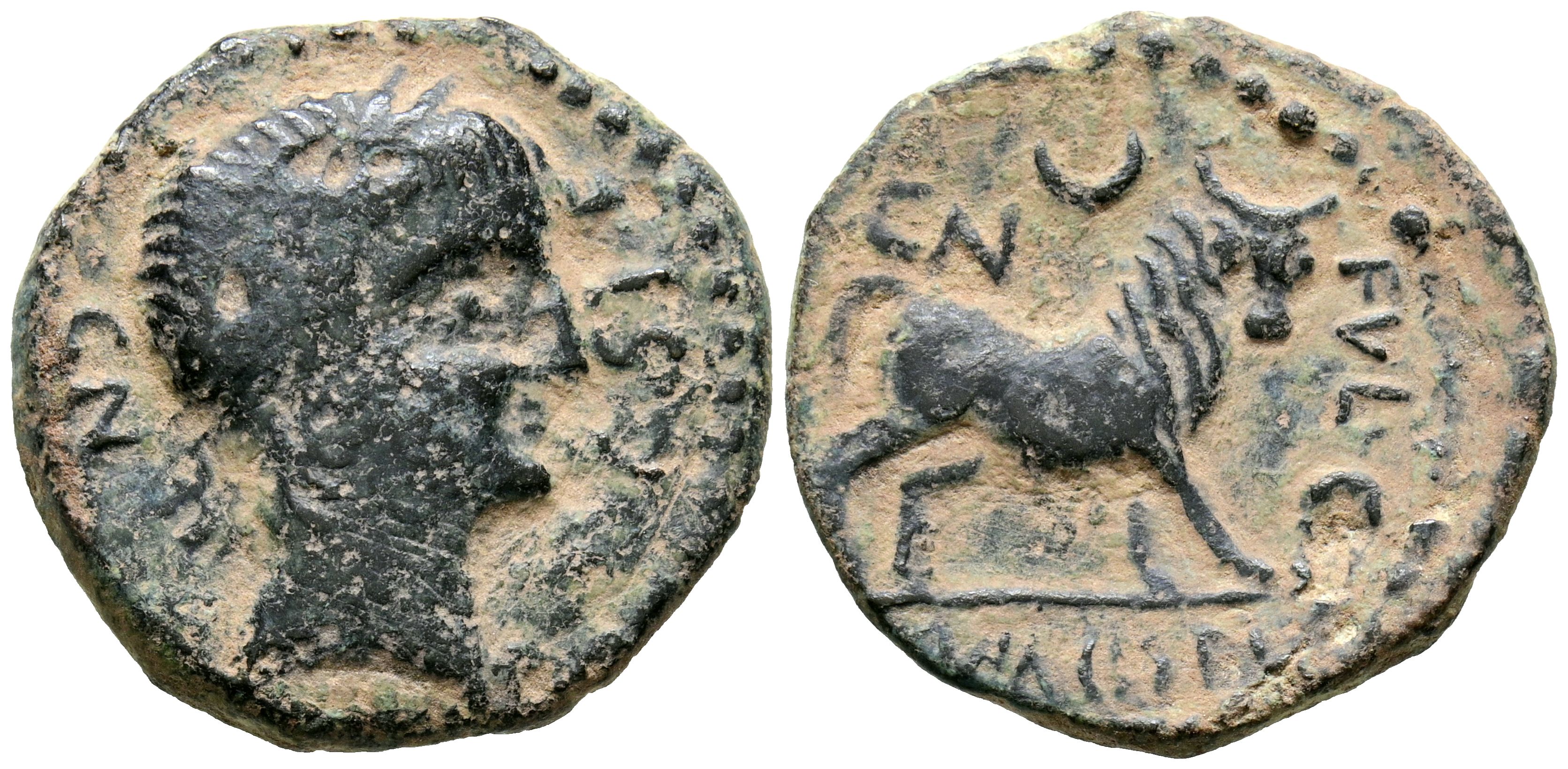 CASTULO (Cazlona, Jaén). Semis. (Ae. 6.55g/23mm). (FAB-728). Anv: Diademed male head on the right, around legend: CN VOC STFR. Rev: Bull to the right, above: CN crescent, in front: CN FVL CN F, below Iberian legend: CaSTeLe. Very Fine.