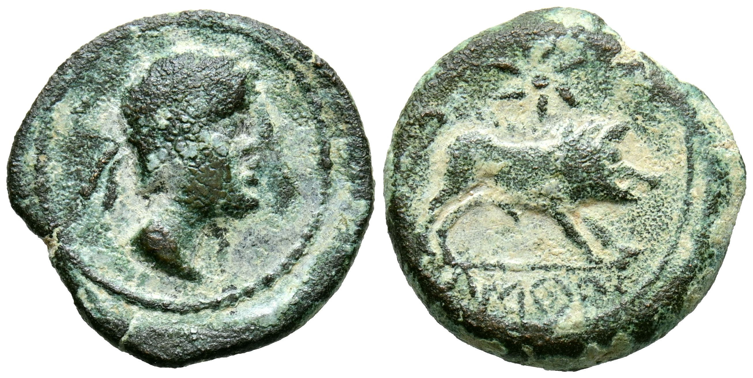 English CASTULO (Cazlona, ​​Jaén). Quadrant. (Ae. 3.72g/18mm). 180 BC (FAB-736). Anv: Male head to the right, in front Iberian letter Ca. Rev: Wild boar to the right, star above, Iberian legend CaSTeLE below. Very Fine.