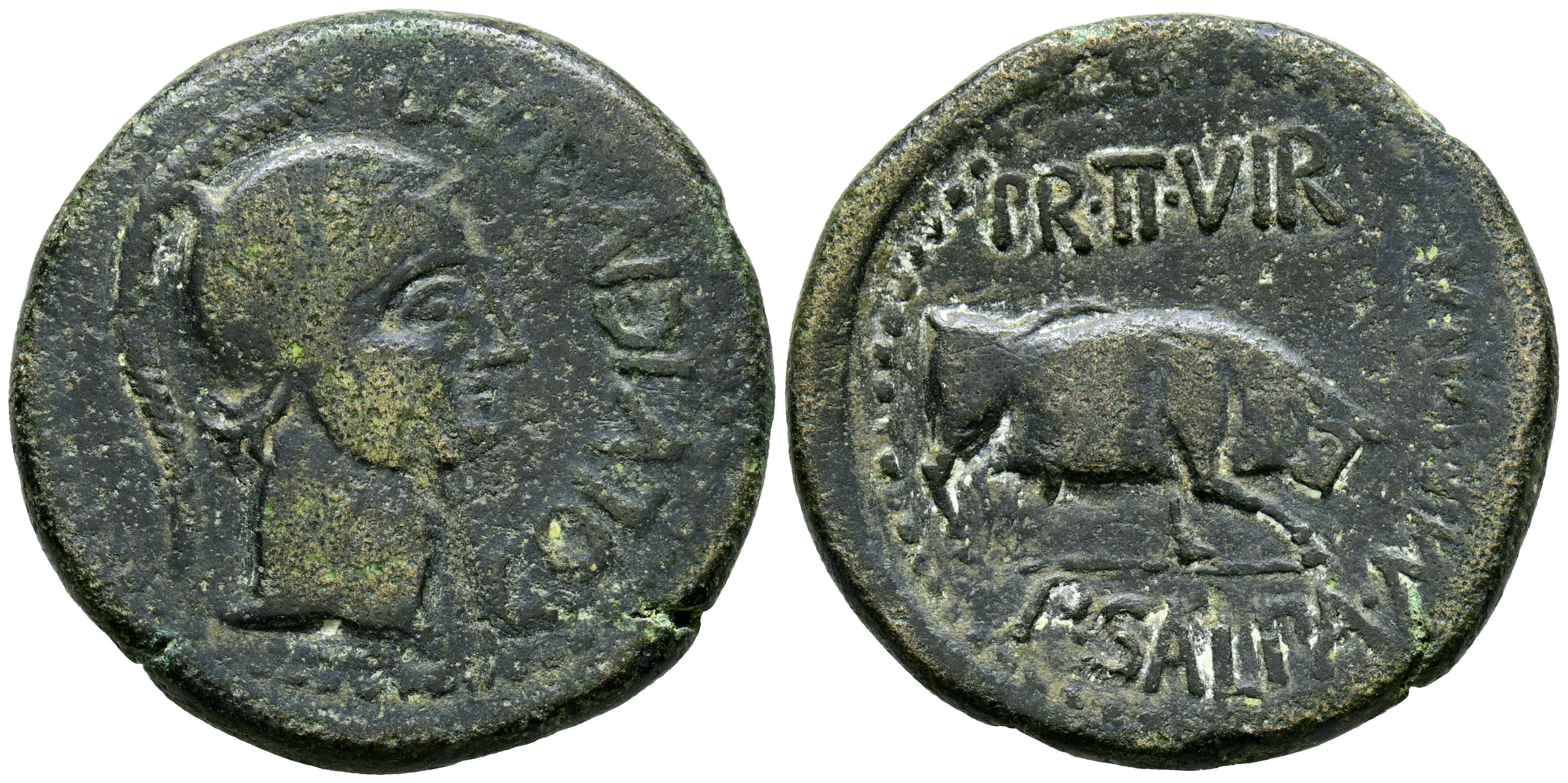 CELSE (Velilla del Ebro, Zaragoza). As. (Ae. 15.43g/30mm). 50-30 BC (FAB-797). Anv: Male head with helmet on the right, in front legend: COL VIC IVL LEP. Rev: Bull charging to the right, above legend: PR II VIR, below legend: P SALPA M FVLI. Good Fine.