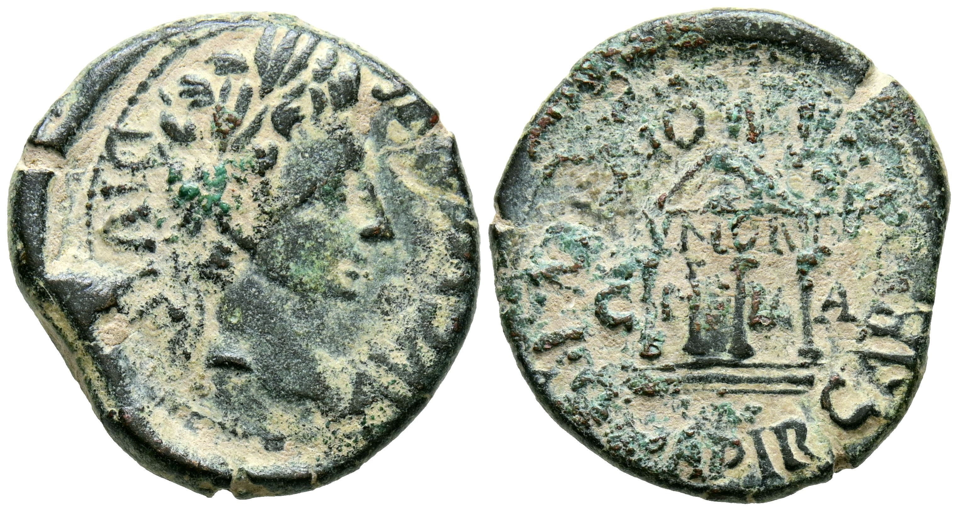 ILICI (Elche, Alicante). Semis. (Ae. 5.82g/22mm). 27 BC-14 AD (FAB-1519). Anv: Laureate head of Augustus to the right, around legend: AVGVSTVS DIVI F. Rev: Tetrastyle temple, with inscription: IVNONI, between the columns: CIIA, around: Q PAPIR CAR Q TERE MONT II VIR Q. Almost Very Fine.