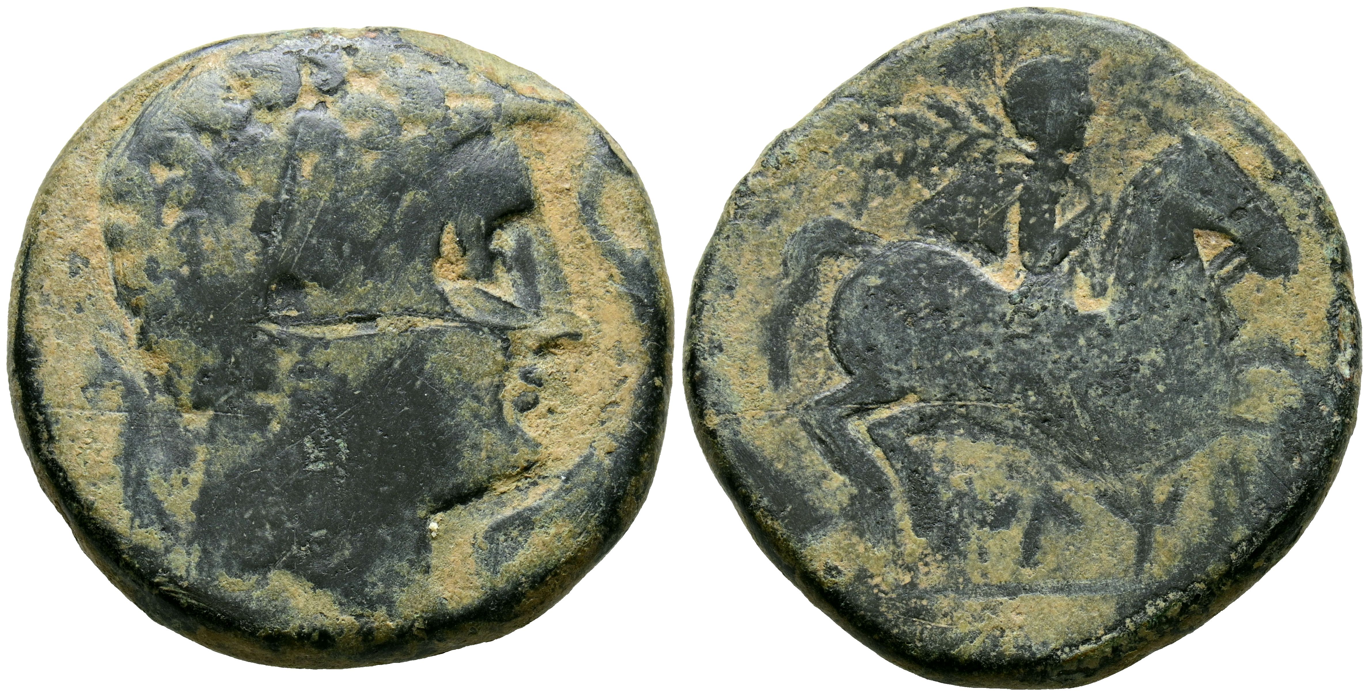English ILTIRTA (Lérida). As. (Ae. 25.60g/33mm). 200-20 BC (FAB-1461). Anv: Male head surrounded by three dolphins to the right. Rev: Rider with palm and chlamys to right, below Iberian legend: ILTiRTa. Good Fine.