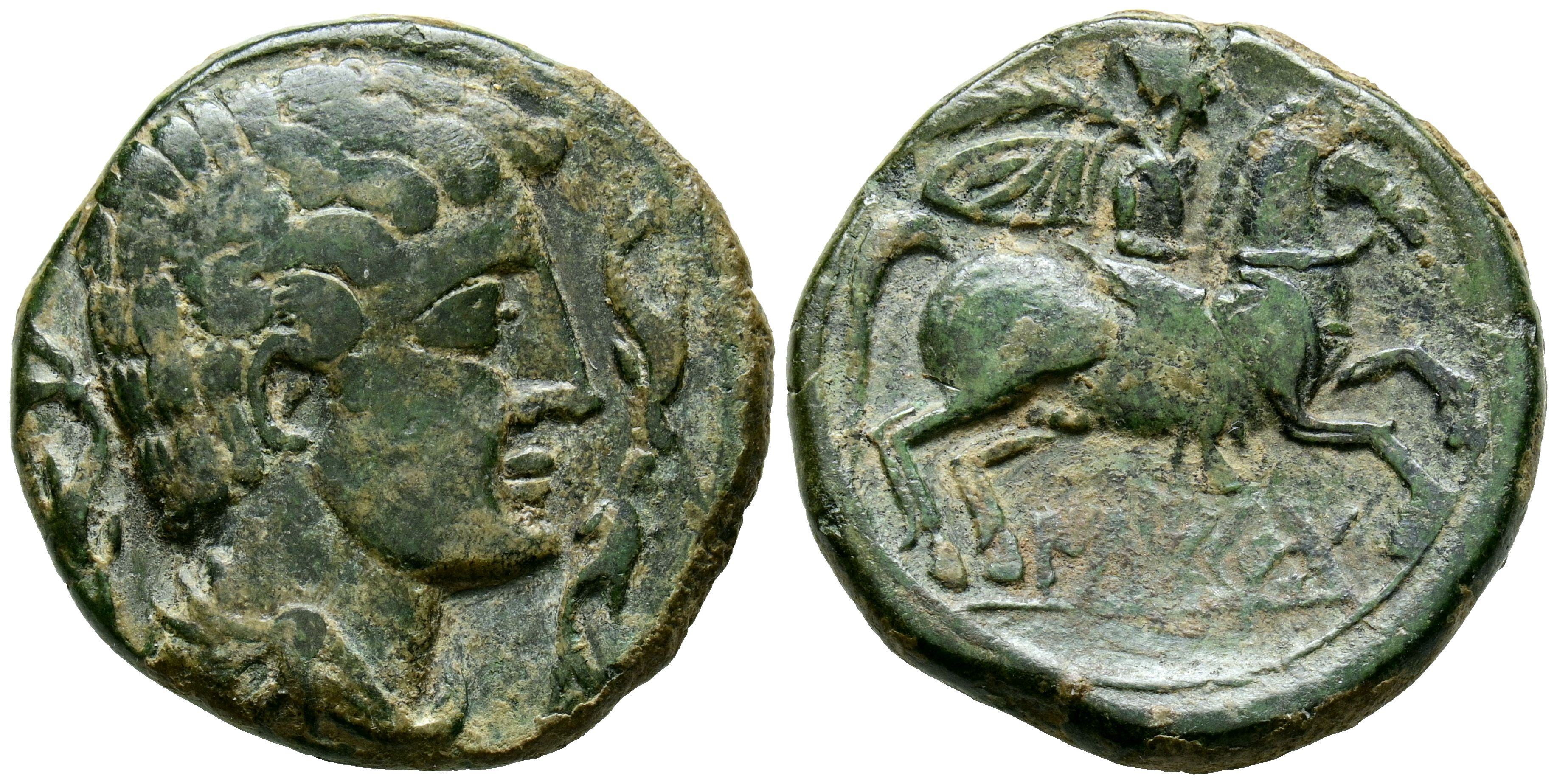 English ILTIRTA (Lérida). As. (Ae. 10.79g/26mm). 200-20 BC (FAB-1465). Anv: Male head to the right, around three dolphins. Rev: Rider with palm to the right, below Iberian legend: ILTiRTa. Good Very Fine.