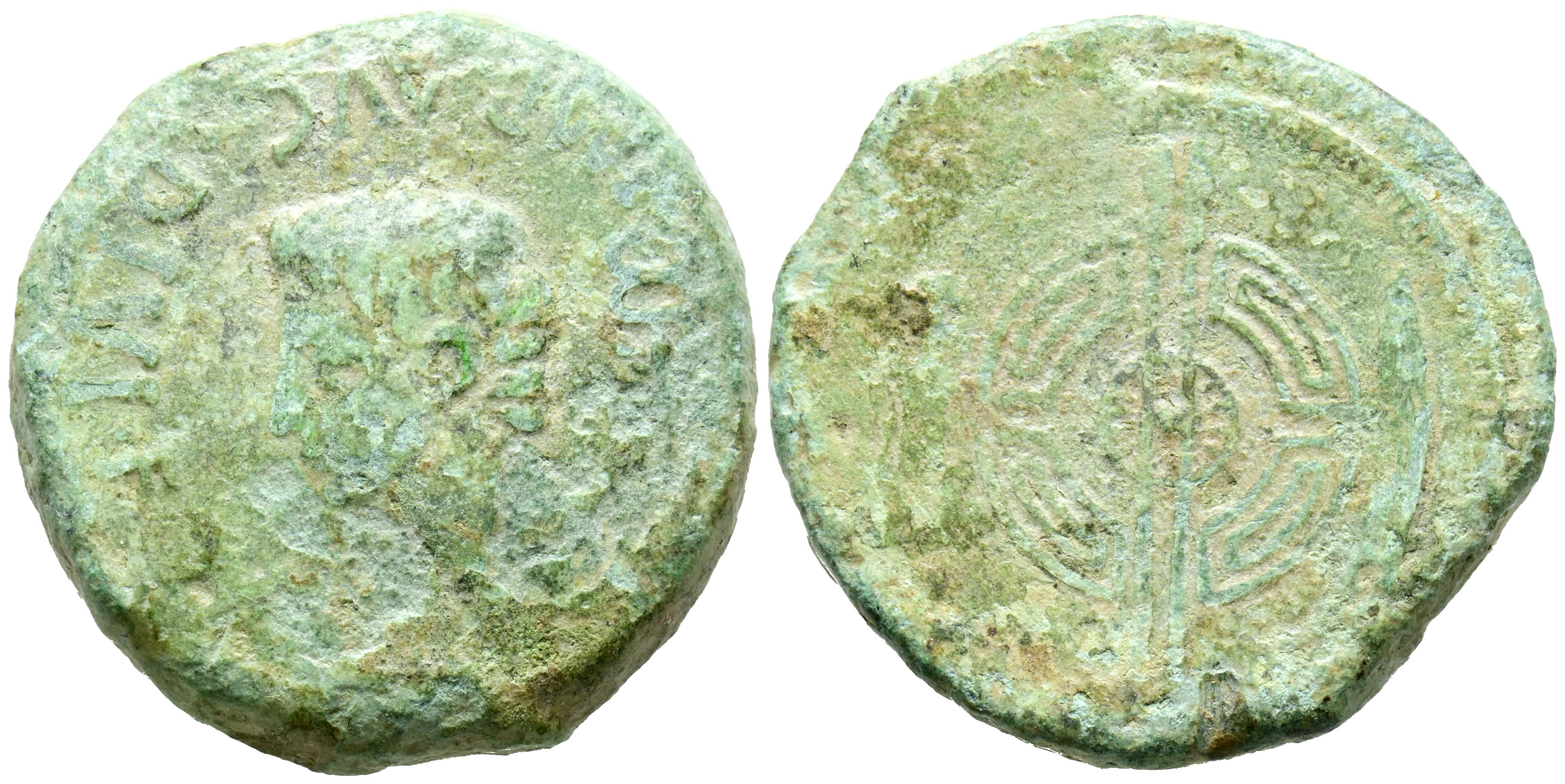 LUCO AUGUSTI (Lugo). As. (Ae. 11.82g/25mm). 27 BC-14 AD (FAB-1702). Anv: Head of Augustus to the left, between spike and caduceus, above legend: IMP AVG DIVI F. Rev: Front roundel with edge, between short sword and falcata. Good Fine/ Almost Very Fine. Scarce copy.