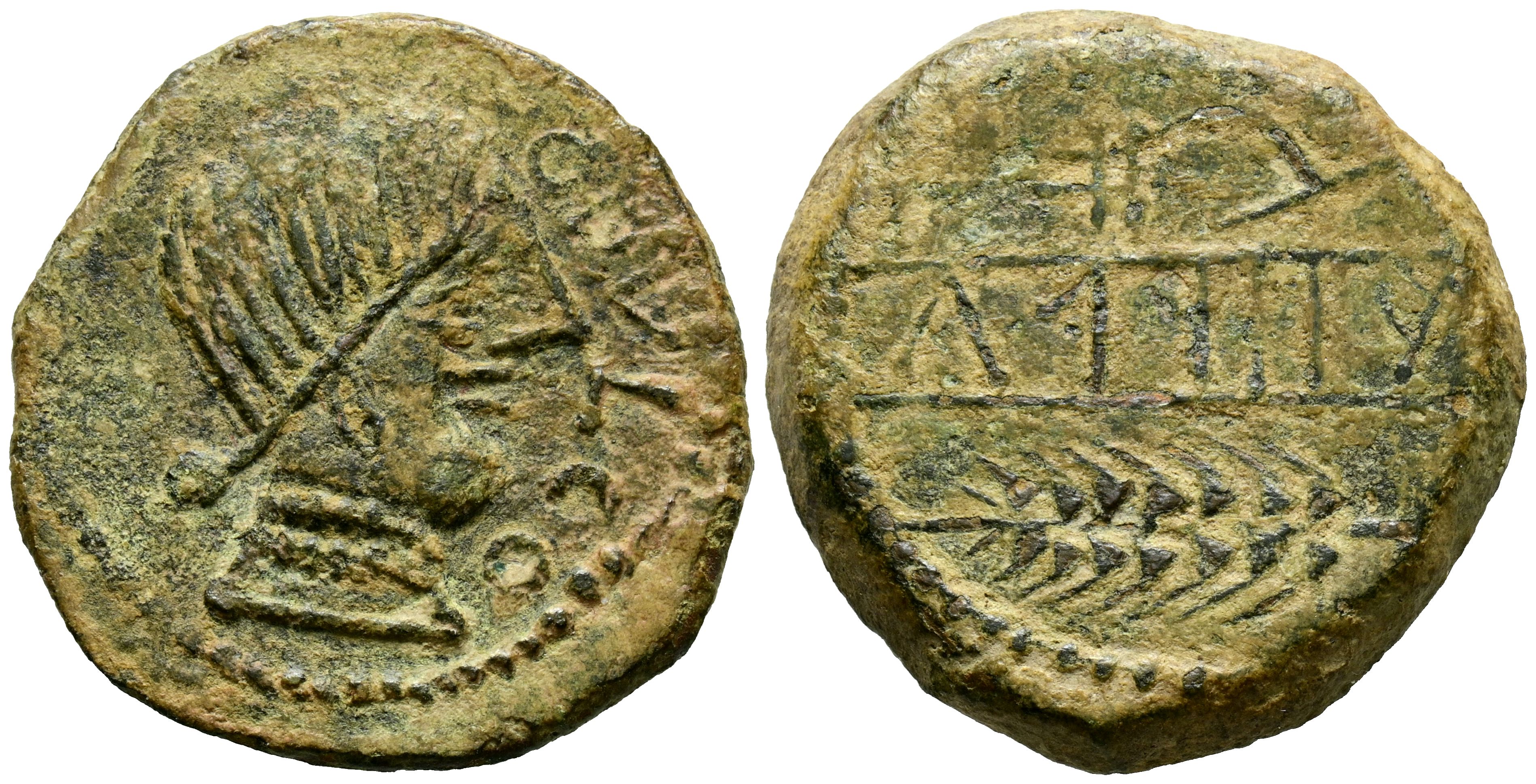 OBULCO (Porcuna, Jaén). As. (Ae. 12.57g/27mm). 220-20 BC (FAB-1804). Anv: Female head to the right, in front legend: OBVLCO. Rev: Iberian legend: IBuLCa, between plow on the right and ears on the left. Almost Very Fine.