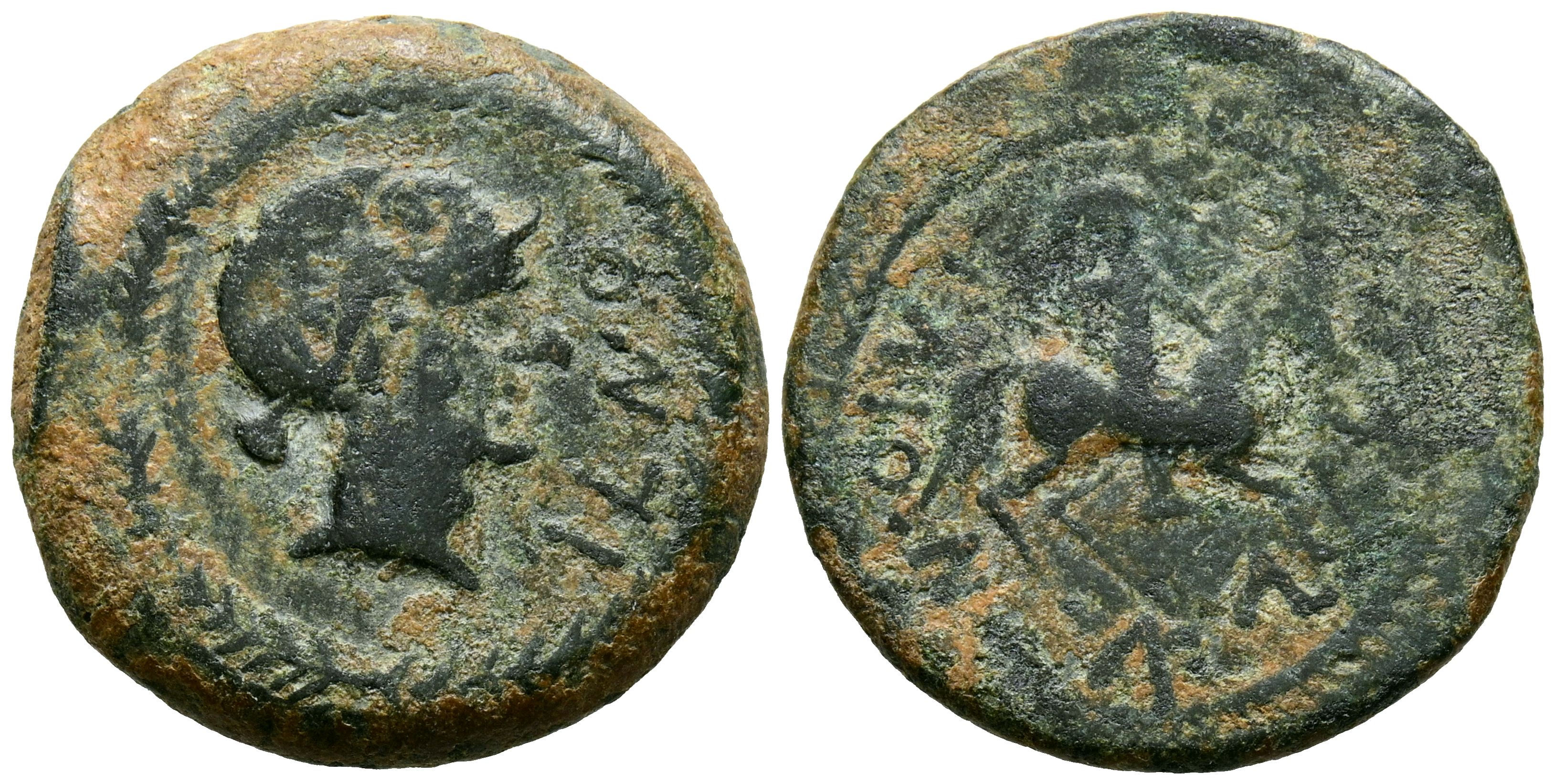 OBULCO (Porcuna, Jaén). Semis. (Ae. 7.46g/23mm). 220-20 BC (FAB-1829). Anv: Female head to the right, in front legend: ILNO, all within a laurel wreath. Rev: Rider with spear to the right, around legend: OBVLCO NAAL. Almost Very Fine.