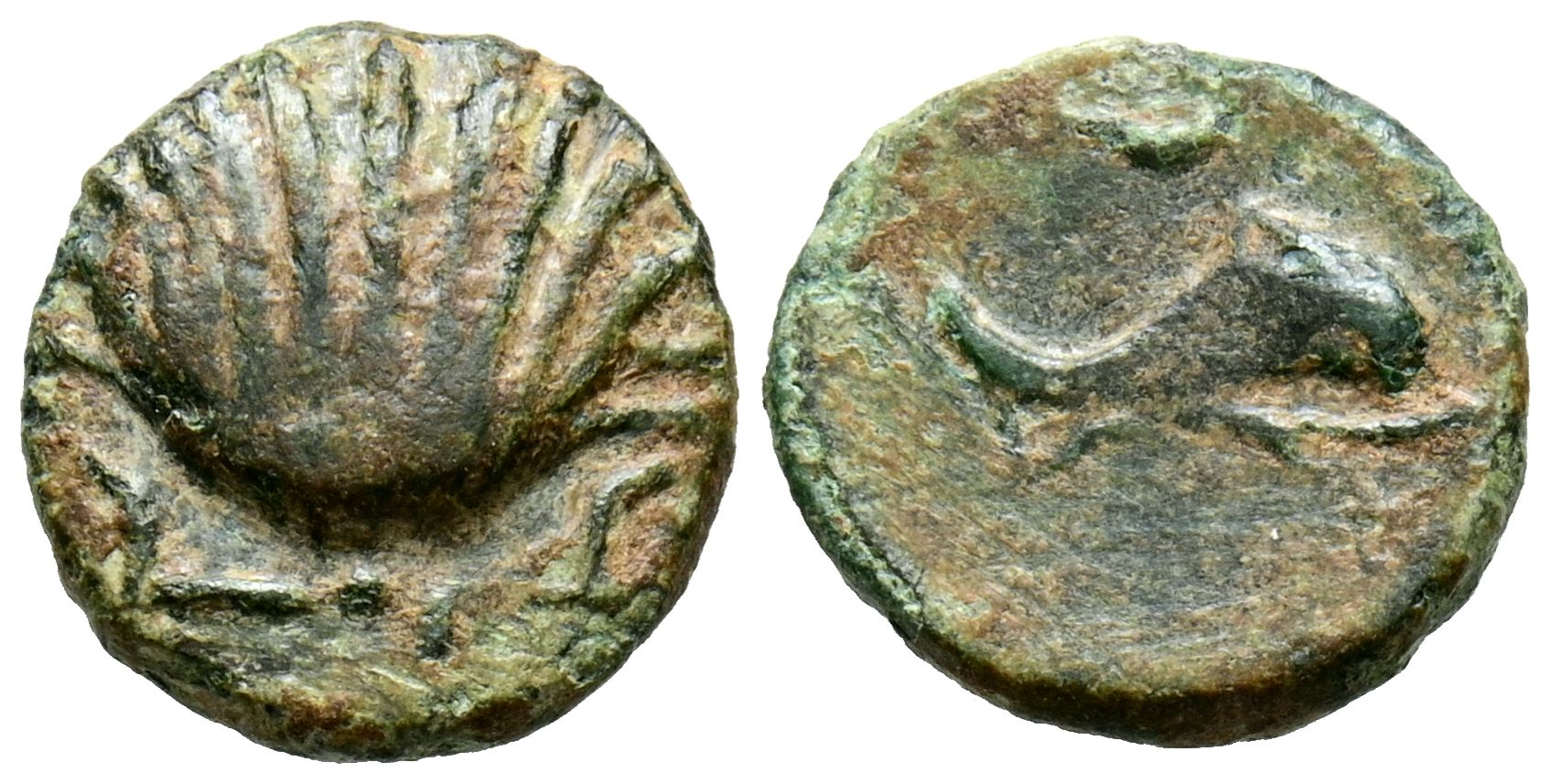 English ARSE-SAGUNTO (Sagunto, Valencia). Sextant. (Ae. 1.19g/11mm). 170-20 BC (FAB-2064). Anv: Shell. Rev: Dolphin to the right, crescent above, Iberian letter A and star below. Very Fine.