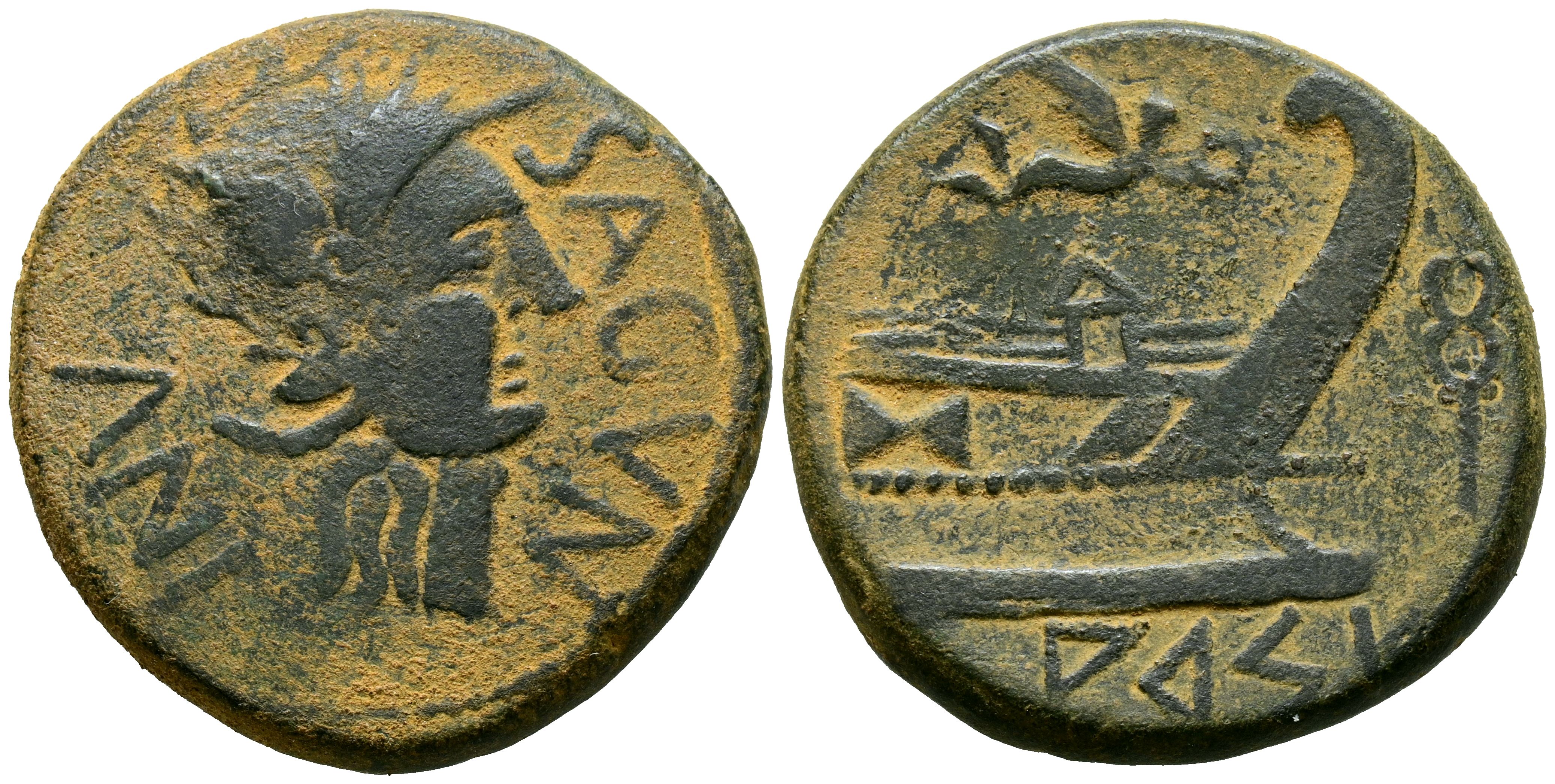 ARSE-SAGUNTO (Sagunto, Valencia). As. (Ae. 17.03g/29mm). 50-20 BC (FAB-2078). Anv: Galley head of Rome to the right, around legend: SAGVNTINV. Rev: Bow to the right, above Victoria, to the right caduceus, below Iberian legend: ARSE. Almost Very Fine.