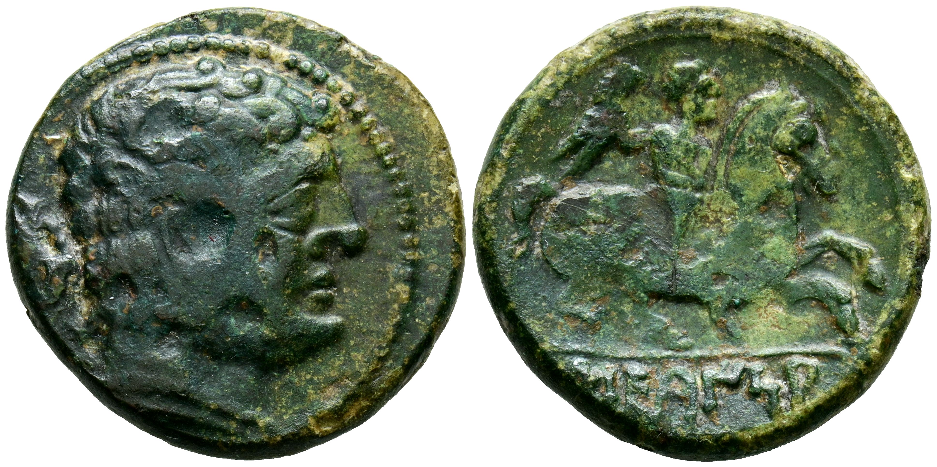 SECAISA (Segeda, Zaragoza). As. (Ae. 11.65g/27mm). 120-20 BC (FAB-2124). Anv: Male head on the right, lion behind. Rev: Horseman with banner with eagle to the right, below Iberian legend: SECaISA. Almost Very Fine. Scarce copy.