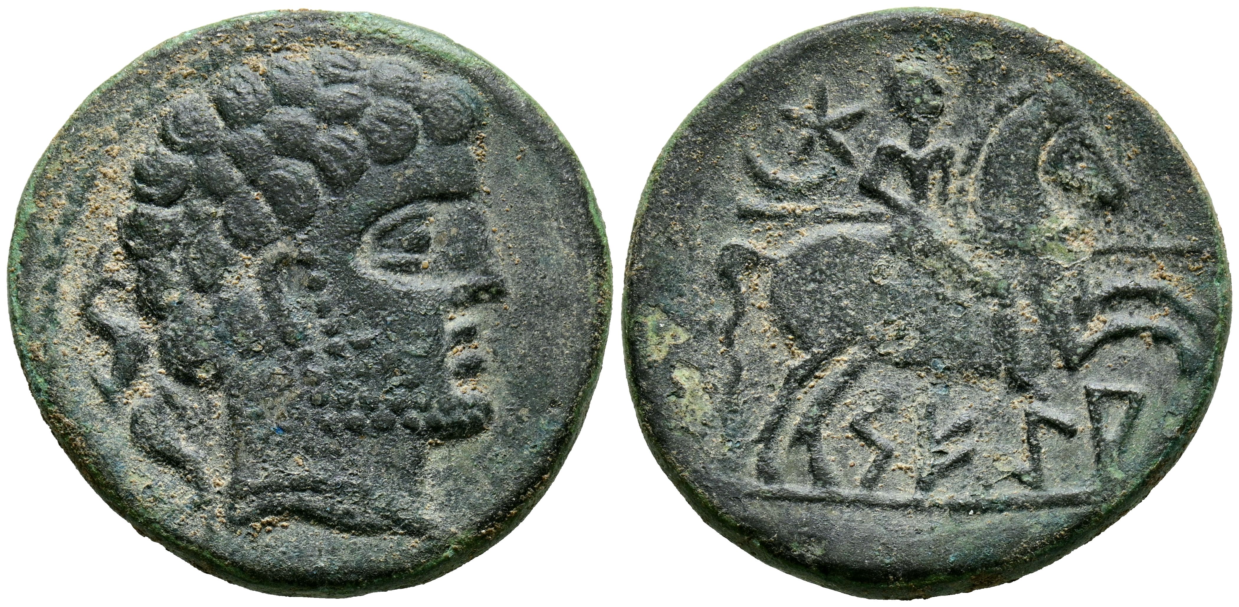 SEGIA (Ejea de los Caballeros, Zaragoza). As. (Ae. 13.48g/29mm). 120-20 BC (FAB-2157). Anv: Male bearded head on the right, behind two dolphins. Rev: Rider with spear to the right, crescent with star above, Iberian legend below: SEGiA. Very Fine. Cleaned and repatinated.
