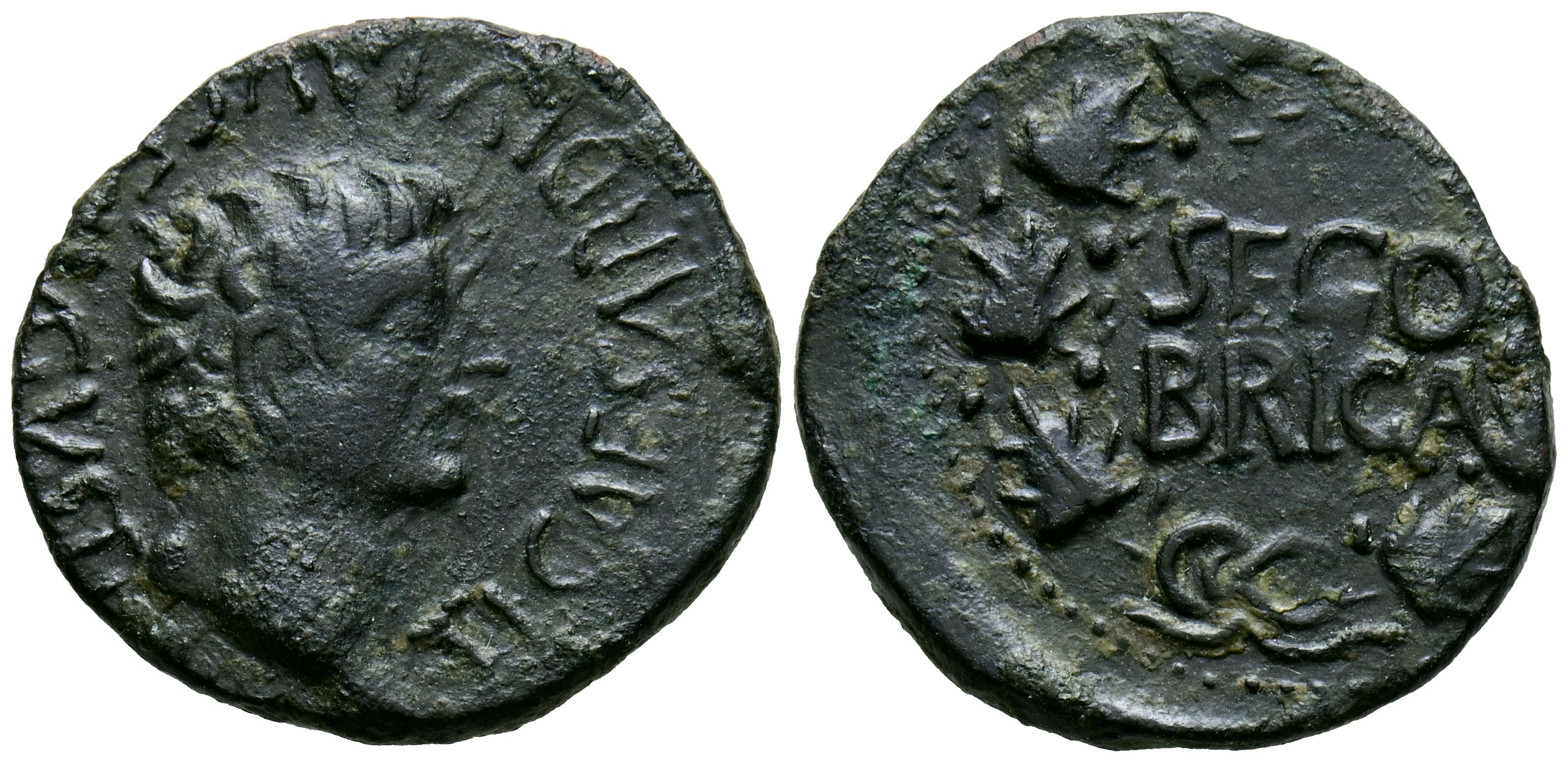 SEGOBRIGA (Saelices, Cuenca). Semis. (Ae. 5.31g/22mm). 14-36 AD (FAB-2190). Anv: Head of Tiberius to the right, around legend: TI CAESAR DIVI AVG F AVGVS F IMP. Rev: Legend: SEGOBRIGA, inside laurea. Very Fine.