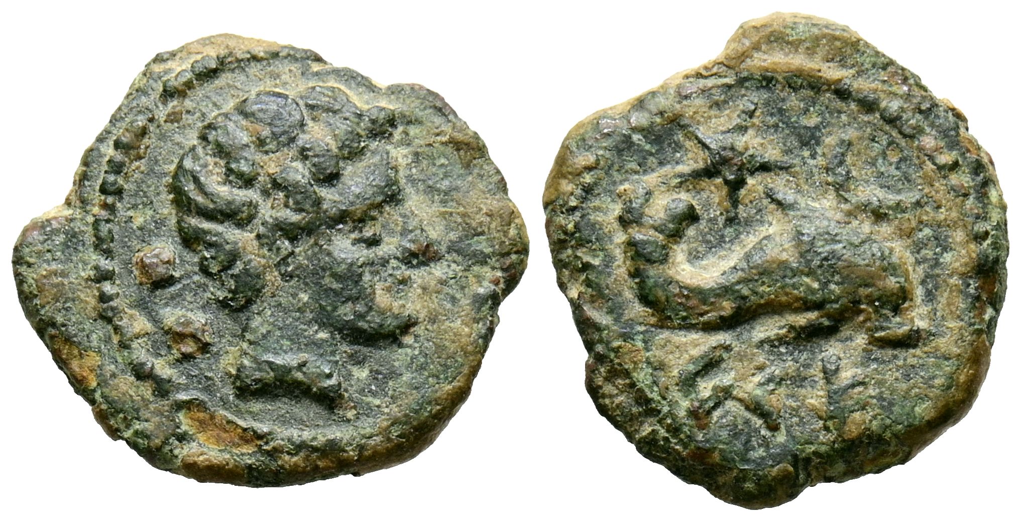 CESE (Tarragona). Sextant. (Ae. 1.83g/14mm). 120-20 BC (FAB-2344). Anv: Male head on the right, two points behind. Rev: Dolphin to the right, star and crescent above, Iberian legend below: CeSE. Very Fine.