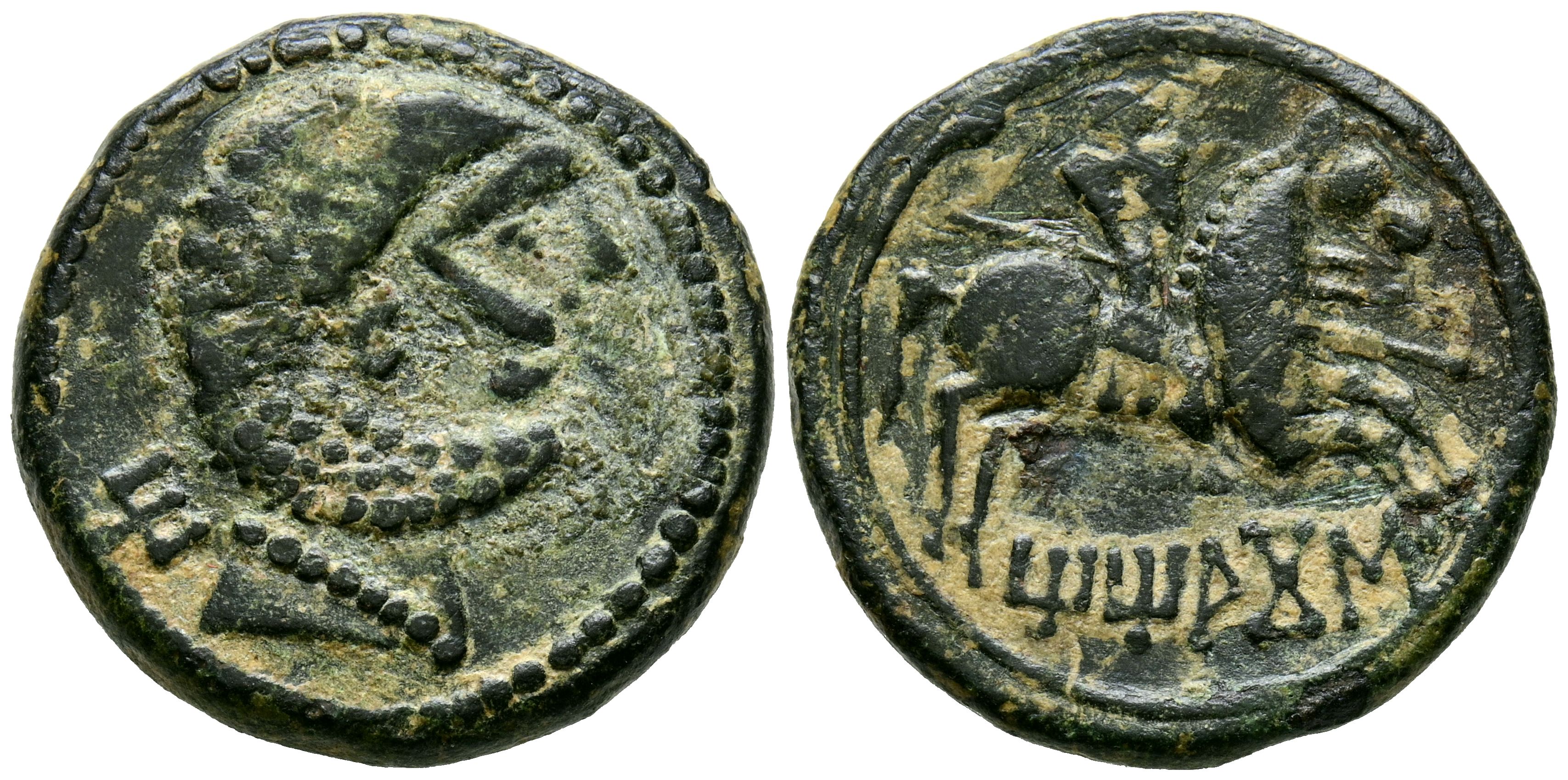 TITIACOS (Tricio, La Rioja). As. (Ae. 9.14g/24mm). 120-20 BC (FAB-2394). Anv: Bearded male head on the right, behind Iberian letter: Ti. Rev: Rider with lance to the right, below curved Iberian legend: TiTiACoS. Almost Very Fine. Cleaned.