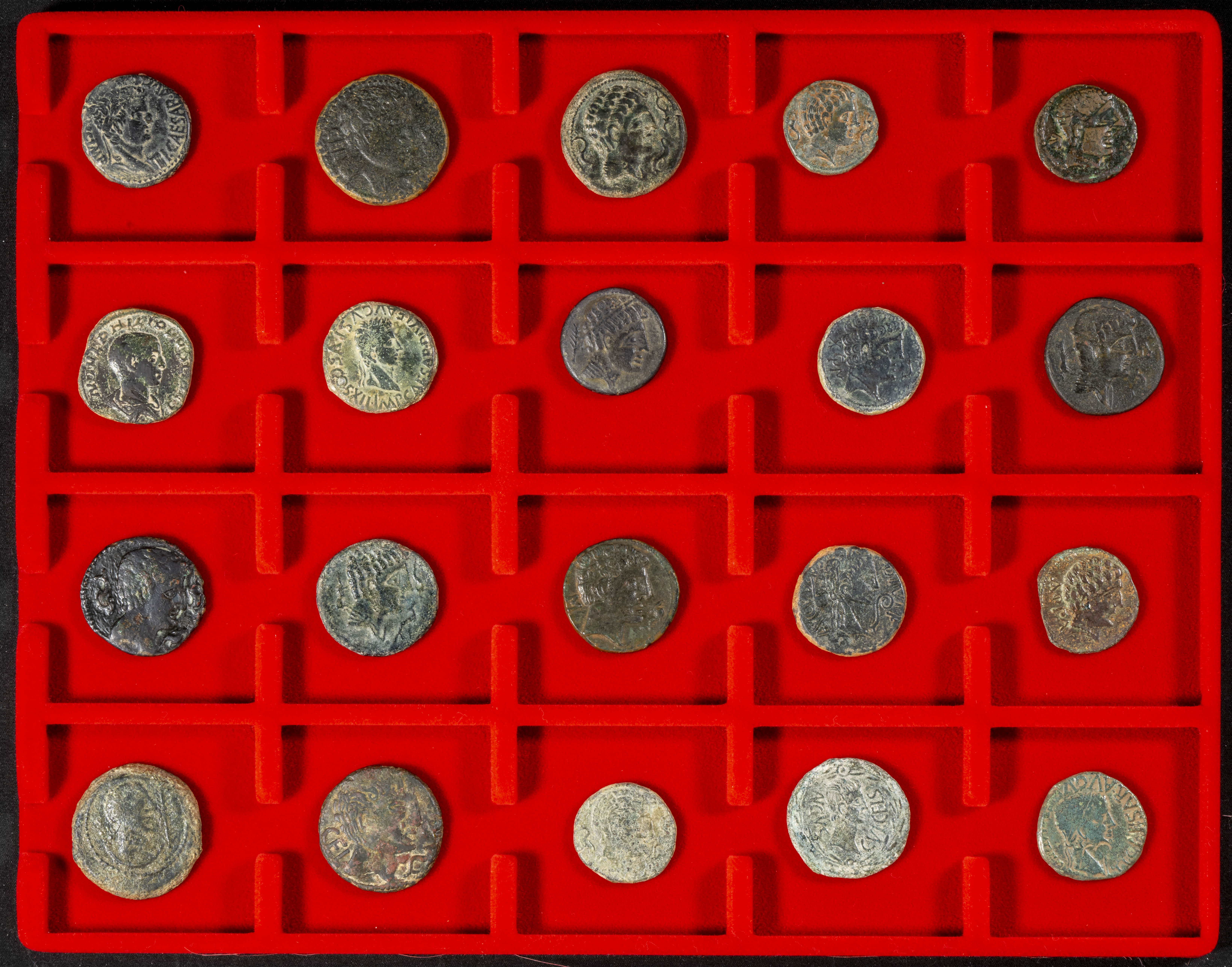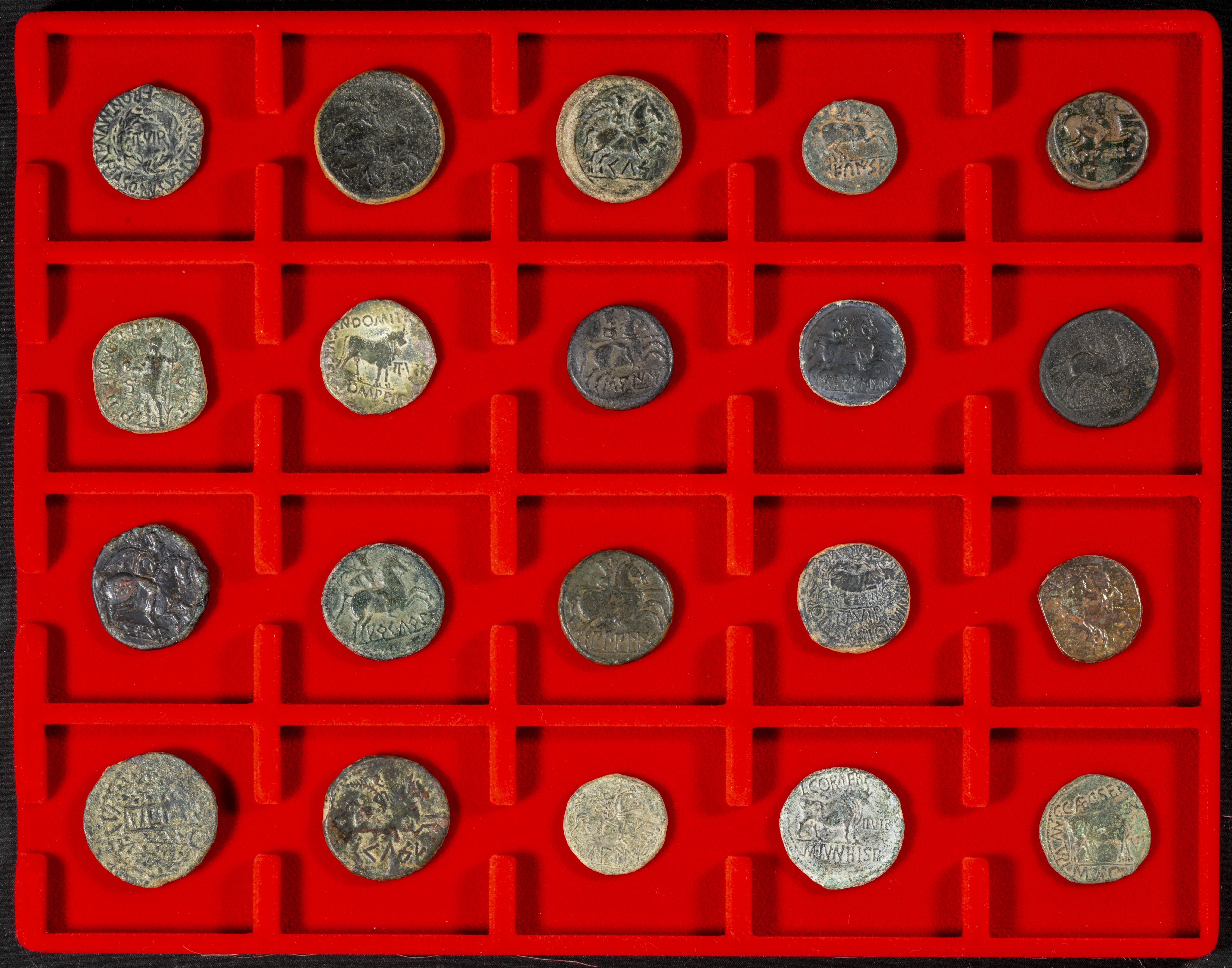 English Beautiful and interesting collection of 20 ancient bronzes (19 Iberian aces and 1 Roman sestertius) with a wide variety of mints represented: Saiti, Celsa, Arcedurgi, Bornescon, Lagine or Conterbia Cárbica among others. The Iberian ace, minted between the 3rd and 1st centuries BC and throughout the entire peninsular geography (there are records of around 150 different mints), is an excellent piece to learn about the social, political and cultural diversity of the peoples that make up the Iberian Peninsula at this time as well as to understand the Romanization process that was carried out at this time. The collection shows different states of conservation, with overall average quality, although there are also enhanced pieces with artificial patinas. IT IS ESSENTIAL TO EXAMINE.