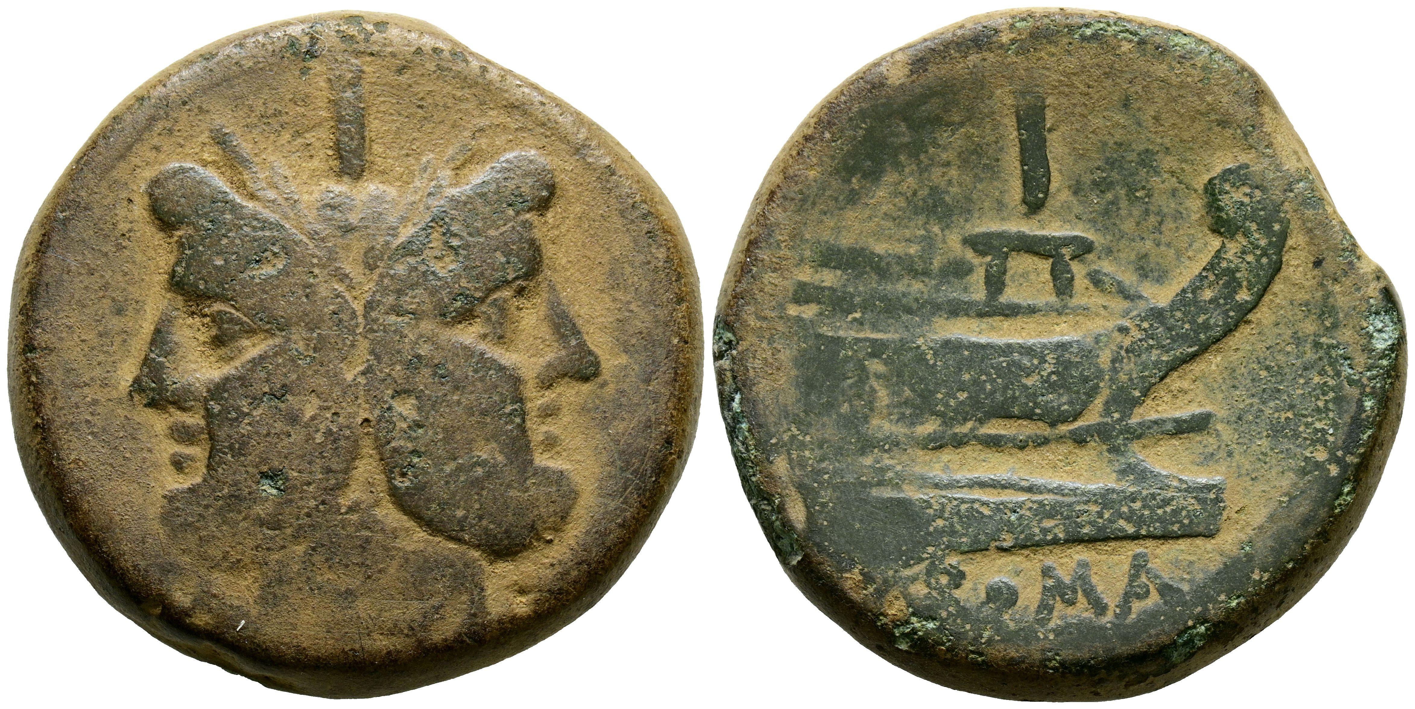 ANONYMOUS. As. (Ae. 32.45g/33mm). 211 BC Rome. (Crawford 56/2). Anv: Double-fronted laureate head of Janus, above: I. Rev: Bow to right, above: I, below legend: ROME. Very Fine.