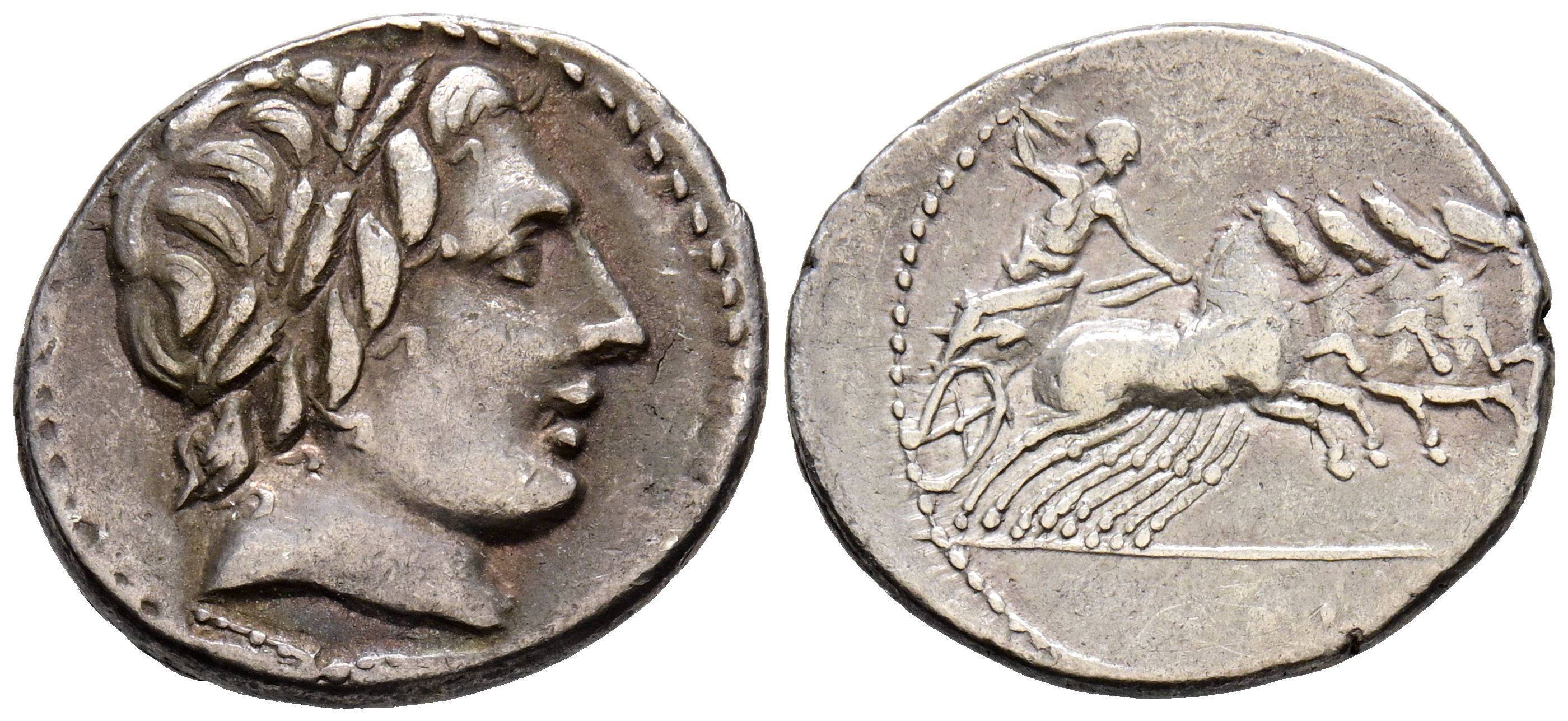 ANONYMOUS. Denarius. (Ar. 3.76g/20mm). 86 BC Rome. (Crawford 350/A2; FFC 85). Anv: Laureate head of Apollo Vejovis to the right, beam of rays below. Rev: Jupiter driving a chariot and throwing lightning to the right. Very Fine.