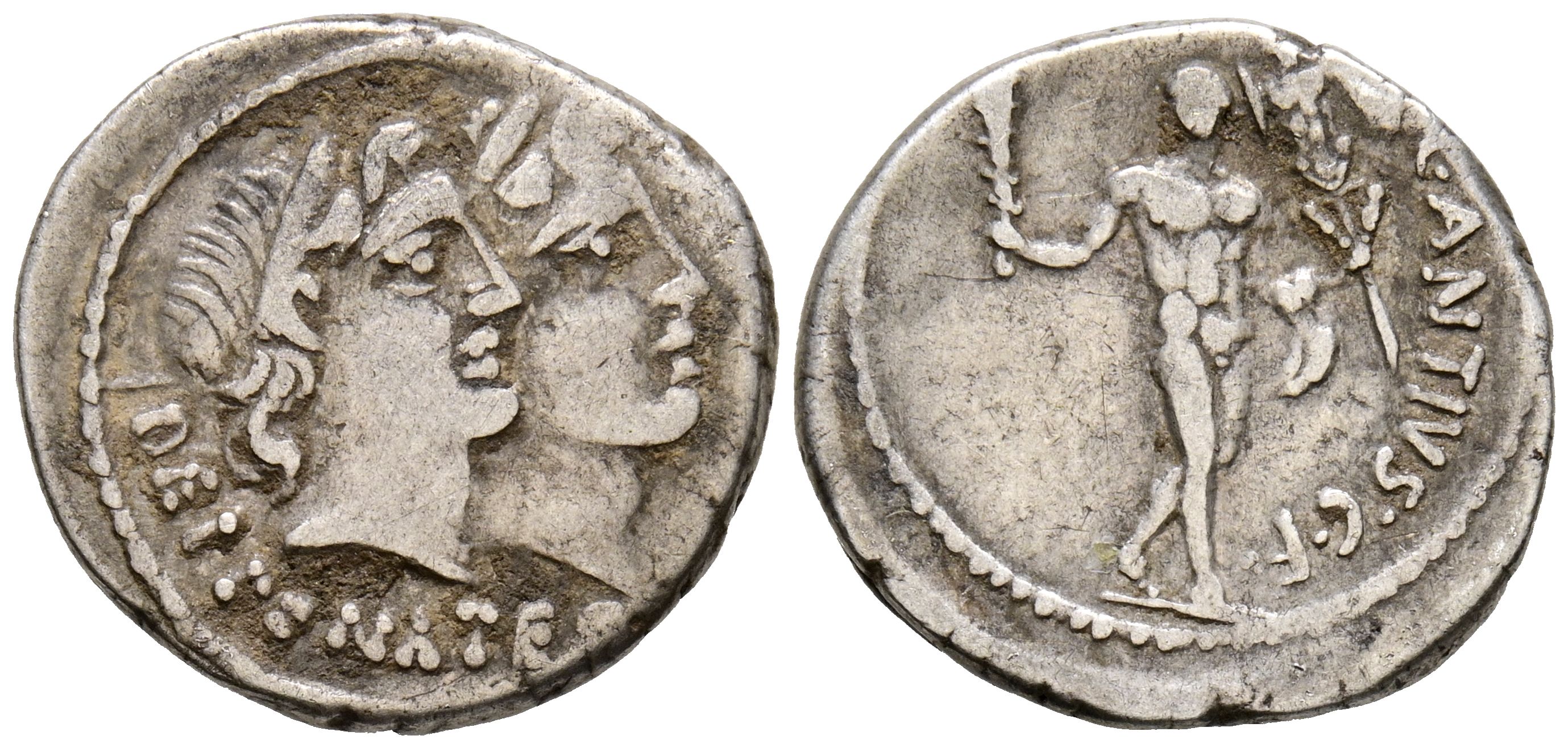 ANTIA GENS. Denarius. (Ar. 3.96g/19mm). 47 BC Rome. (Crawford 455/2b; FFC 155). Anv: Crowned and diademed heads of the gods Penates to the right, around legend: DEI PENATES. Rev: Hercules advancing to the right carrying a mallet, trophy and lion skin, in front legend: C ANTIVS CF. Very Fine. Scarce copy..
