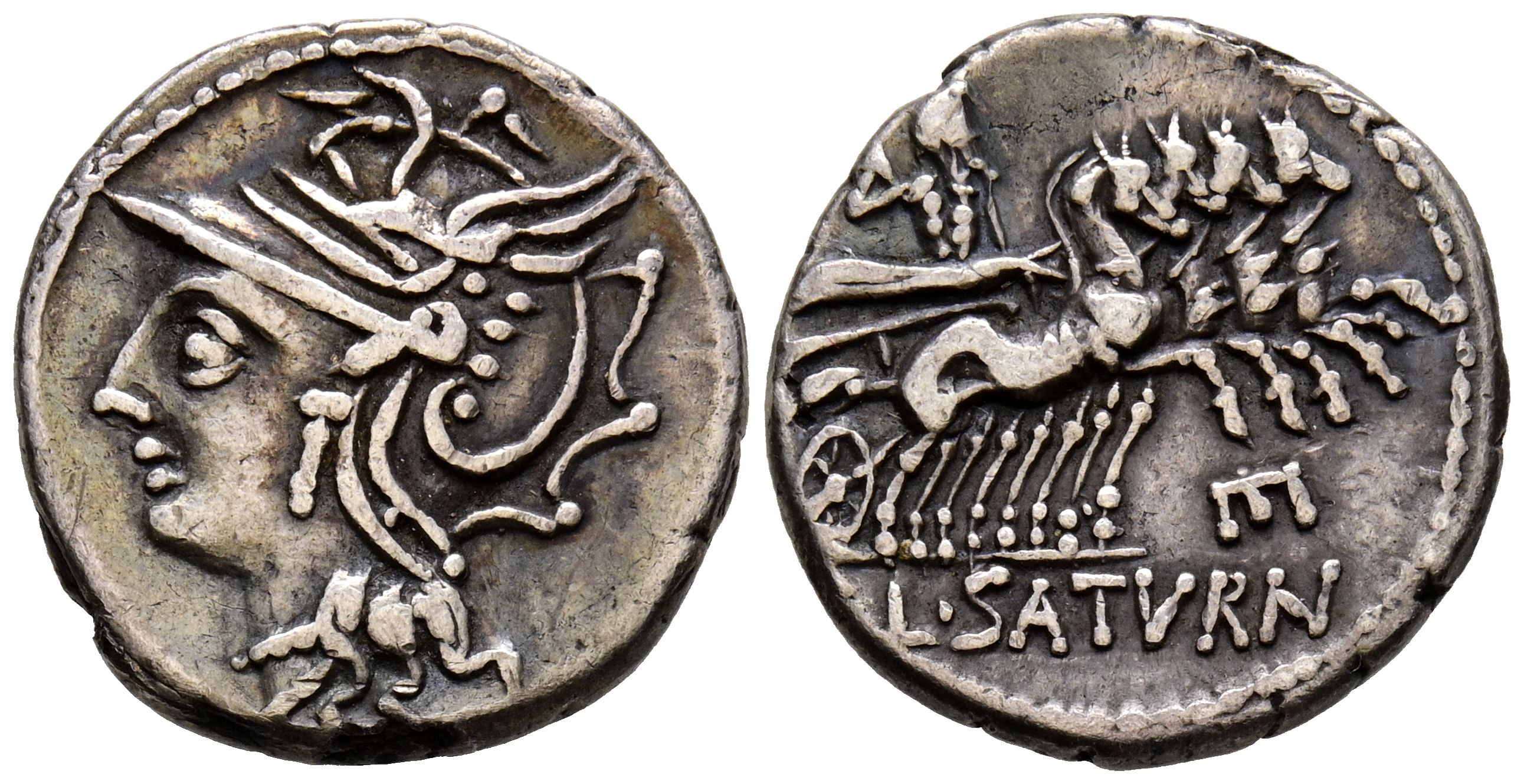 GENS APPULEIA. Denarius. (Ar. 3.94g/18mm). 104 BC Rome. (FFC 162; Crawford 317/3a). Anv: Head of Rome to the left. Rev: Saturn with sword in quadriga to the right, below letter: E, in exergue: L SATVRN. Good Very Fine.