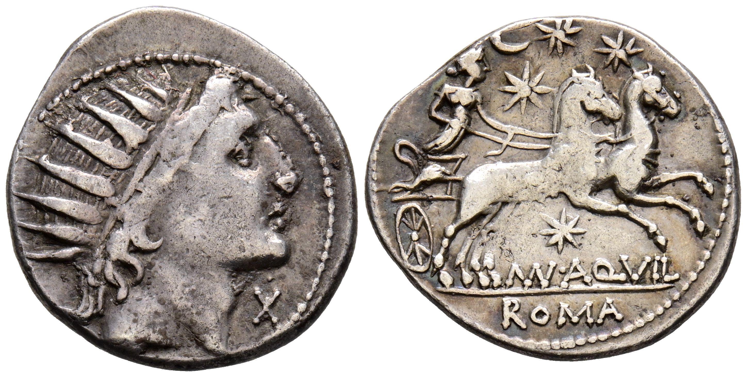 GENS AQUILLIA. Denarius. (Ar. 3.78g/21mm). 109-108 AD Mint of southern Italy. (Crawford 303/1; FFC 166). Anv: Radiated head of the Sun to the right, in front Very Fine.