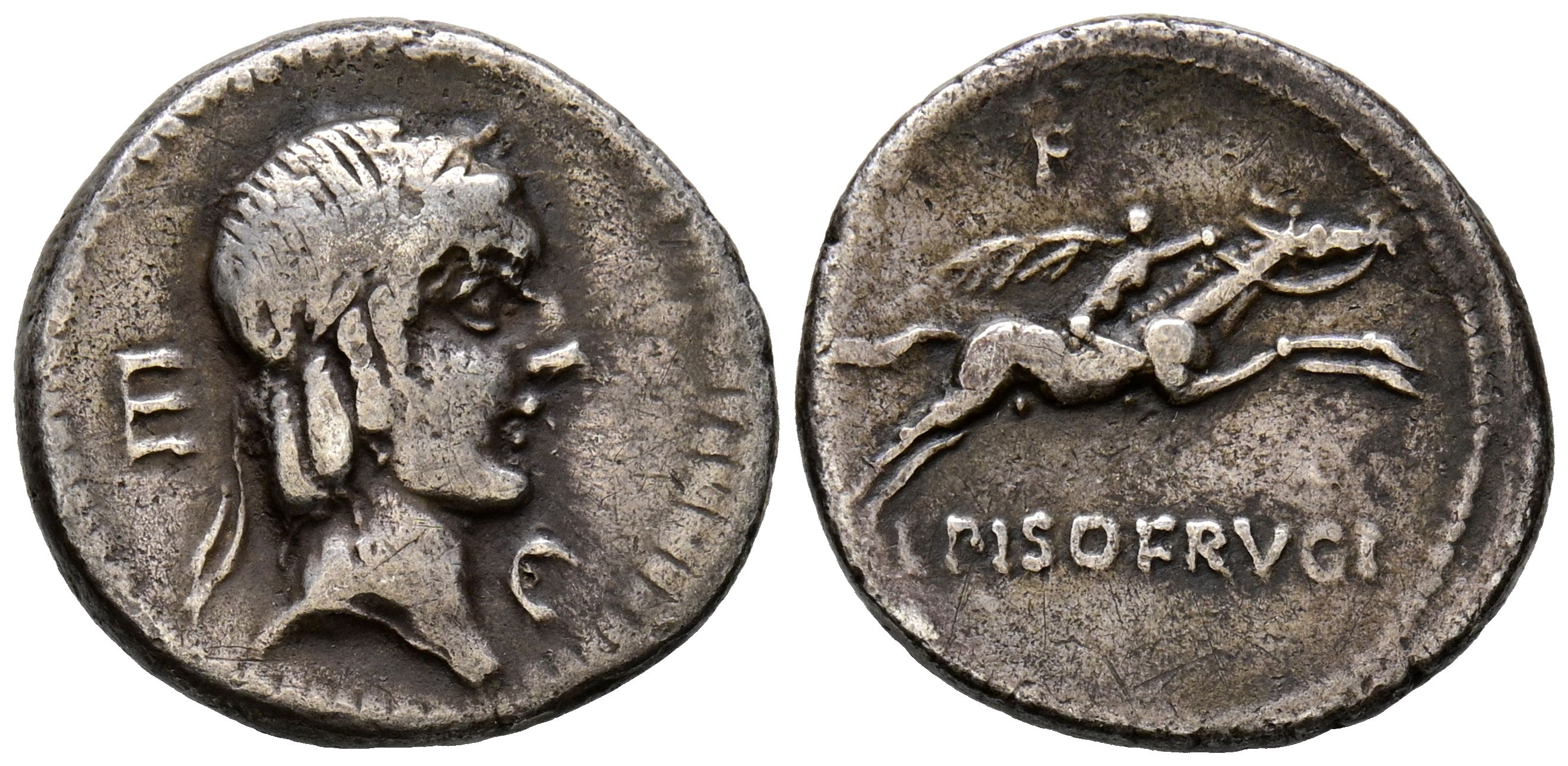GENS CALPURNIA. Denarius. (Ar. 3.58g/18mm). 90-89 BC Rome. (Crawford 340/1; FFC 240). Anv: Laureate head of Apollo on the right, behind number: LXXXXI. Rev: Horseman with palm galloping to the right, below legend: L PISO FRVGI, above number: LXVII, below legend monogram ROMA. Very Fine.
