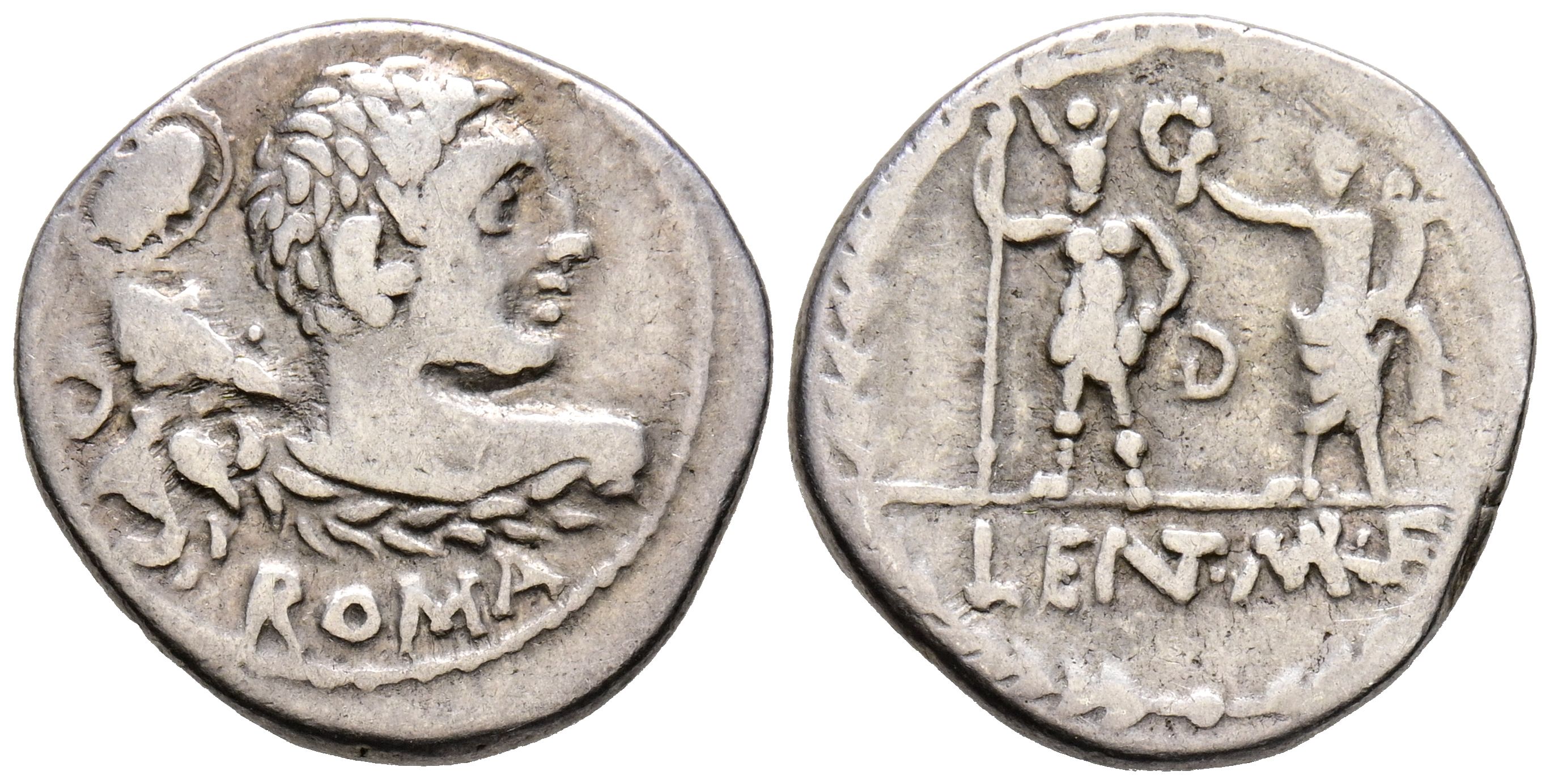 English GENS CORNELIA. Denarius. (Ar. 3.95g/19mm). 100 BC Northern Italy. (FFC 618; Crawford 329/1b). Anv: Bust with mace on the shoulder of Hercules to the right, behind oval shield, in front letter: G, below legend: ROME. Rev: Rome standing with helmet and spear crowned by the Genius of the people with cornucopia, on the left letter: F, in exergue: LENT MAR F. Very Fine.