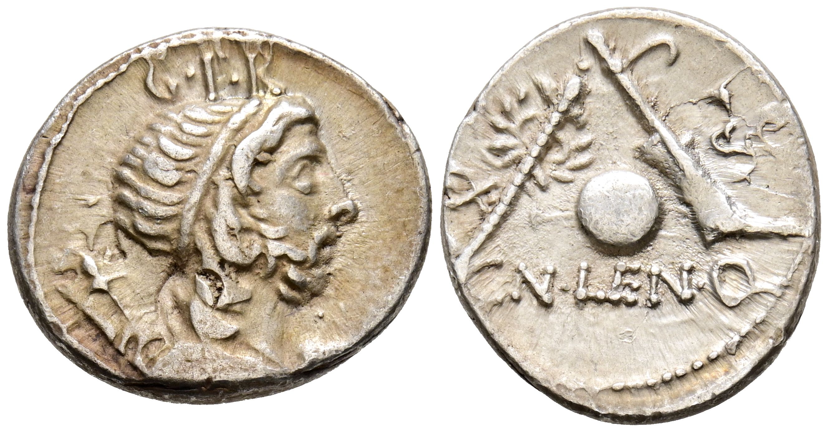 GENS CORNELIA. Denarius. (Ar. 3.98g/20mm). 76-75 BC Hispania. (Crawford 393/1; FFC 627). Anv: Diademed bust of the Genius of the Roman people to the right, scepter behind him, above: GPR. Rev: Terrestrial globe between scepter with laurel wreath and Helm, in field: EX- Uncirculated, below: CN LEN Q. Very Fine.