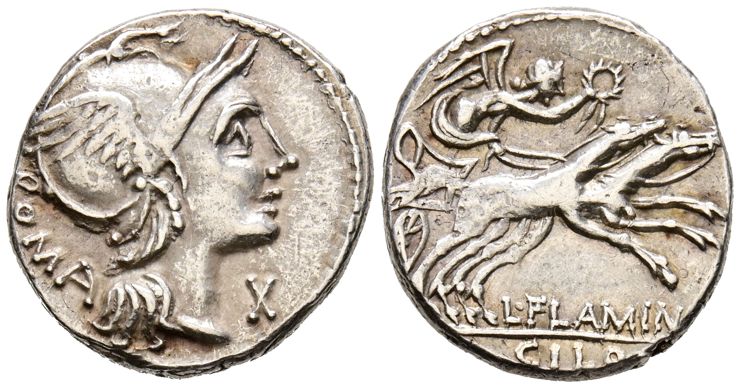 GENS FLAMINIA. Denarius. (Ar. 3.97g/19mm). 109-108 BC Northern Italy. (Crawford 302/1; FFC 708). Anv: Head of Rome to the right, X in front, behind legend: ROME. Rev: Victory with crown in biga to right, below legend: L FLAMINI, in exergue: ROMA. Very Fine.