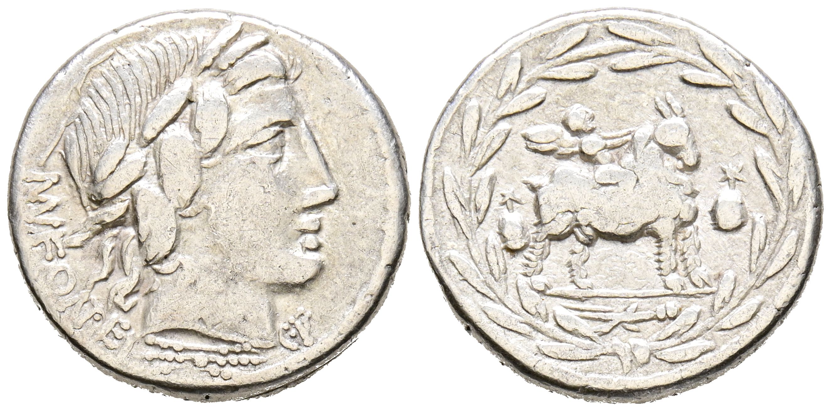 GENS FONTEIA. Denarius. (Ar. 3.85g/118mm). 85 BC Auxiliary workshop of Rome. (Crawford 353/1d; FFC 721). Anv: Laureate head of Apollo to the right, below lightning bolt, around legend: MN FONTEI CF. Rev: Genius on goat to the right, between two caps of the Dioscuri, below thyrsus, all within a laurel wreath. Very Fine.