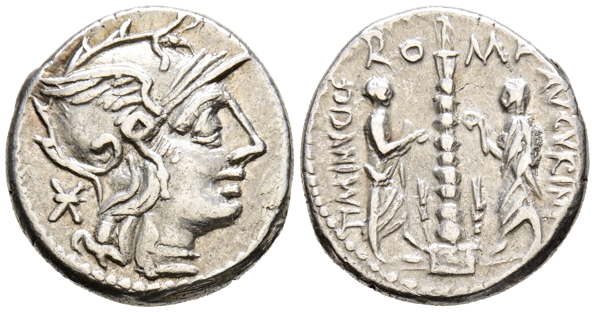 GENS MINUCIA. Denarius. (Ar. 3.81g/18mm). 134 BC Rome. (Crawford 243/1; FFC 925). Anv: Head of Rome to the right, star behind. Rev: Column with statue on top, base decorated with spikes, on each side a robed character standing, Lucius Minucius with bread and plate and M Minucius Faesus with lituum, around legend: TI MINVCI CF AVGVRNI ROMA. Very Fine.