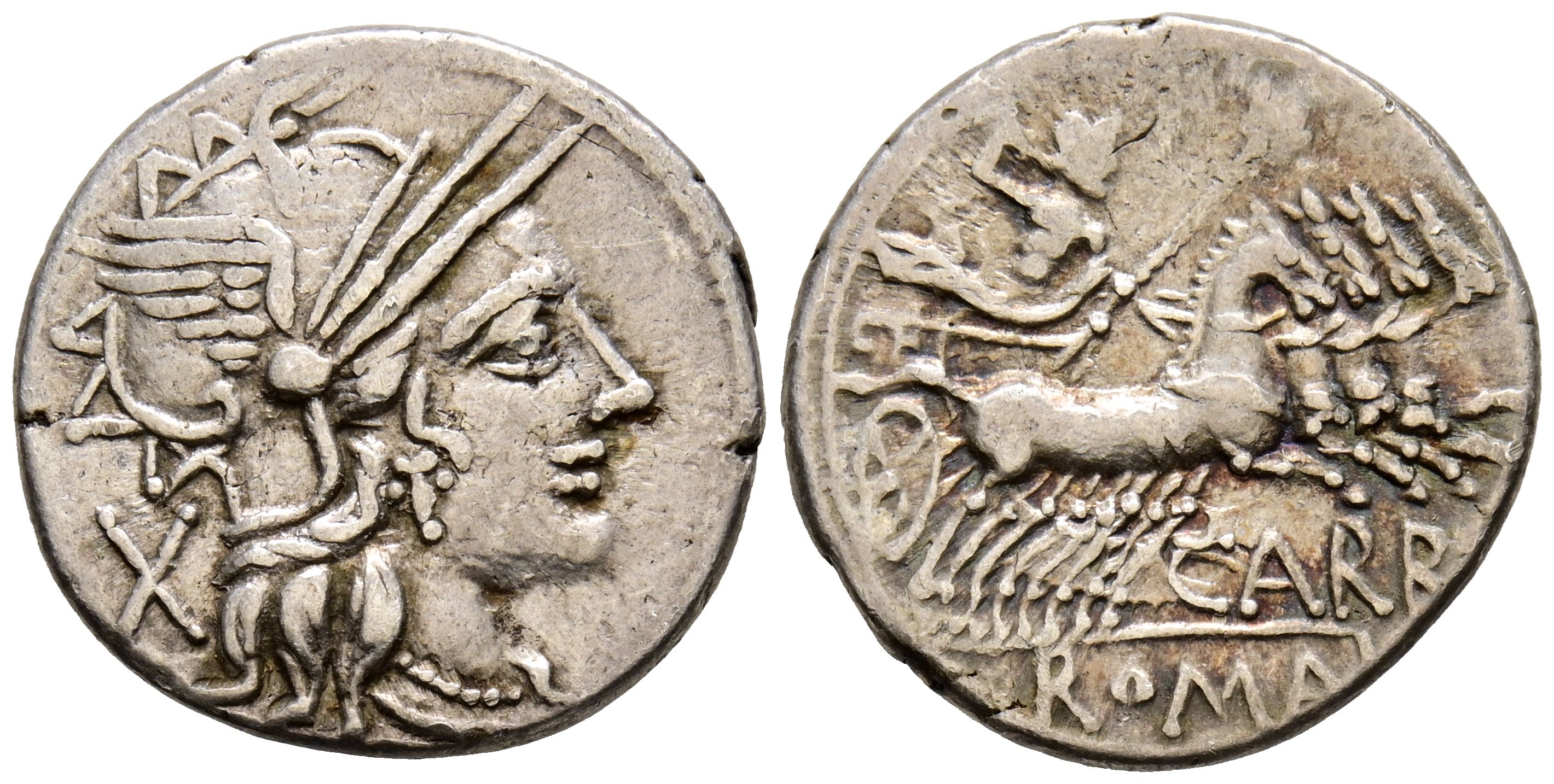 GENS PAPYRIA. Denarius. (Ar. 3.90g/20mm). 122 BC Auxiliary workshop of Rome. (FFC 958; Crawford 279/1). Anv: Head of Rome to the right, behind X. Rev: Jupiter with scepter and rays in a quadriga to the right, below: CARB, in exergue: ROME. Almost Very Fine.