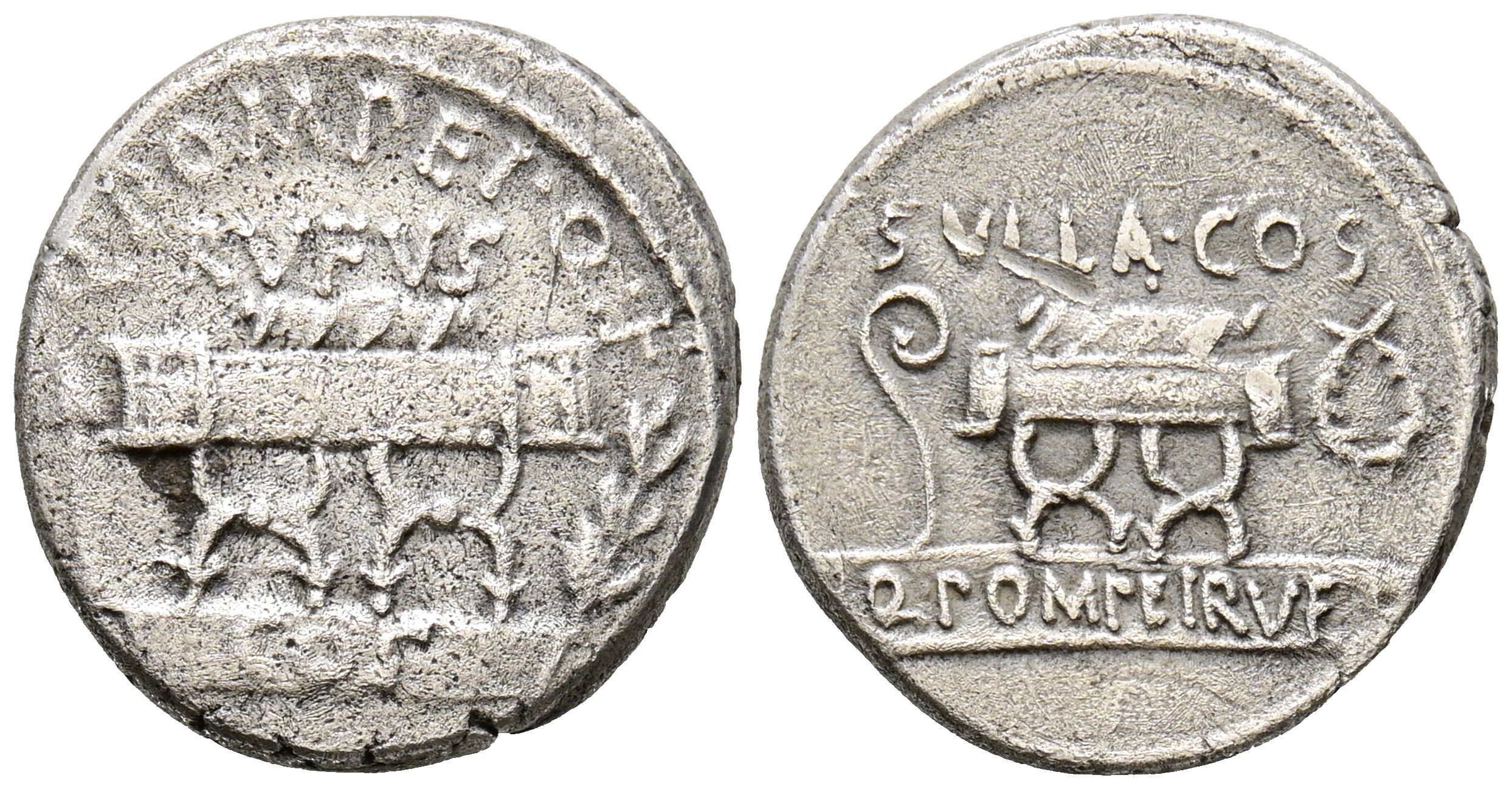 GENS POMPEIA. Denarius. (Ar. 3.78g/18mm). 54 BC Rome. (FFC 1025; Crawford 434/2). Anv: Curul chair, between arrow and laurel branch, above legend: Q POMPEI QF RVFVS, below: COS. Rev: Curul chair between lituo and laurel wreath, above legend: SVLLA COS, below: Q POMPEI RVF. Very Fine.
