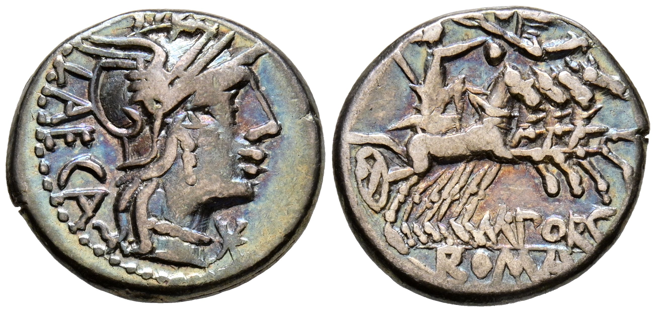 GENS PORTIA. Denarius. (Ar. 3.85g/18mm). 125 BC Rome. (Crawford 270/1; FFC 1051). Anv: Head of Rome to the right, star in front, legend behind: LAECA. Rev: Libertas driving chariot to the right and being crowned by Victoria with a laurel wreath, below: M PORC, in exergue: ROME. Very Fine. Iridescent tone.