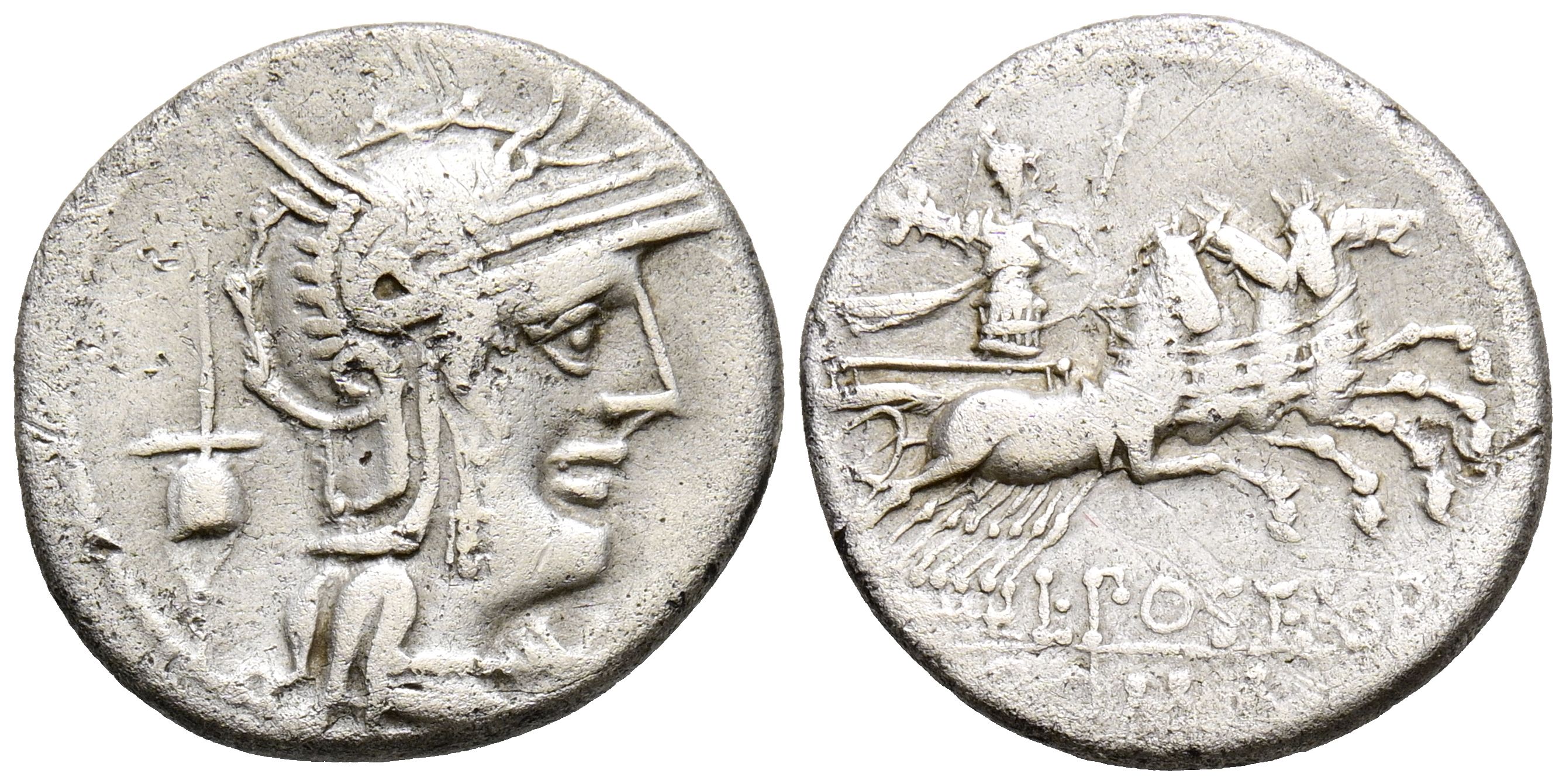 GENS POSTUMIA. Denarius. (Ar. 3.79g/19mm). 131 BC Rome. (FFC 1063; Crawford 252/1). Anv: Head of Rome to the right, star in front, apex behind. Rev: Mars in quadriga to the right with trophy and scepter, below legend: L POST ALB, in exergue: ROMA. Almost Very Fine.