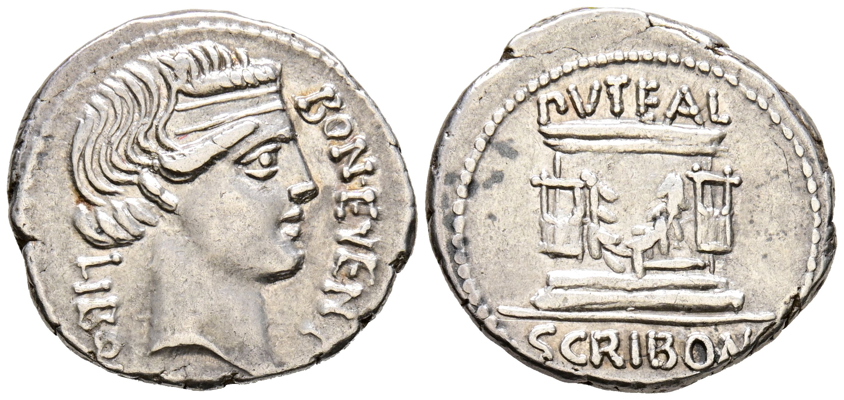 English GENS SCRIBONIA. Denarius. (Ar. 3.89g/20mm). 62 BC Rome. (FFC 1102; Crawford 416/1a). Anv: Diademed head of Bonus Eventus on the right, around legend: LIBO BON EVENT. Rev: Scribonian well decorated with side garlands, hammer below, above and below legend: SCRIBON PVTEAL. Extremely Fine/ Almost Extremely Fine.