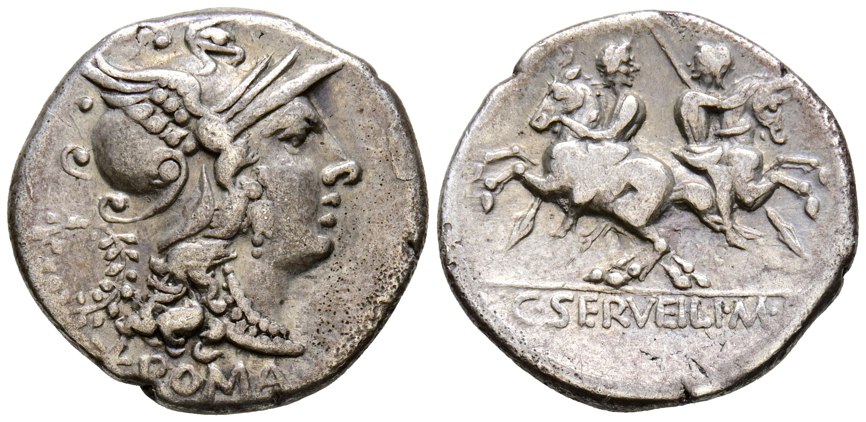 GENS SERVILIA. Denarius. (Ar. 3.69g/20mm). 136 BC Central Italy. (FFC 1116; Crawford 239/1). Anv: Head of Rome to the right, behind laurel wreath and star, below legend: ROME. Rev: The Dioscuri galloping in the opposite direction, above stars, in exergue: C SERVEILI MF. Good Very Fine.