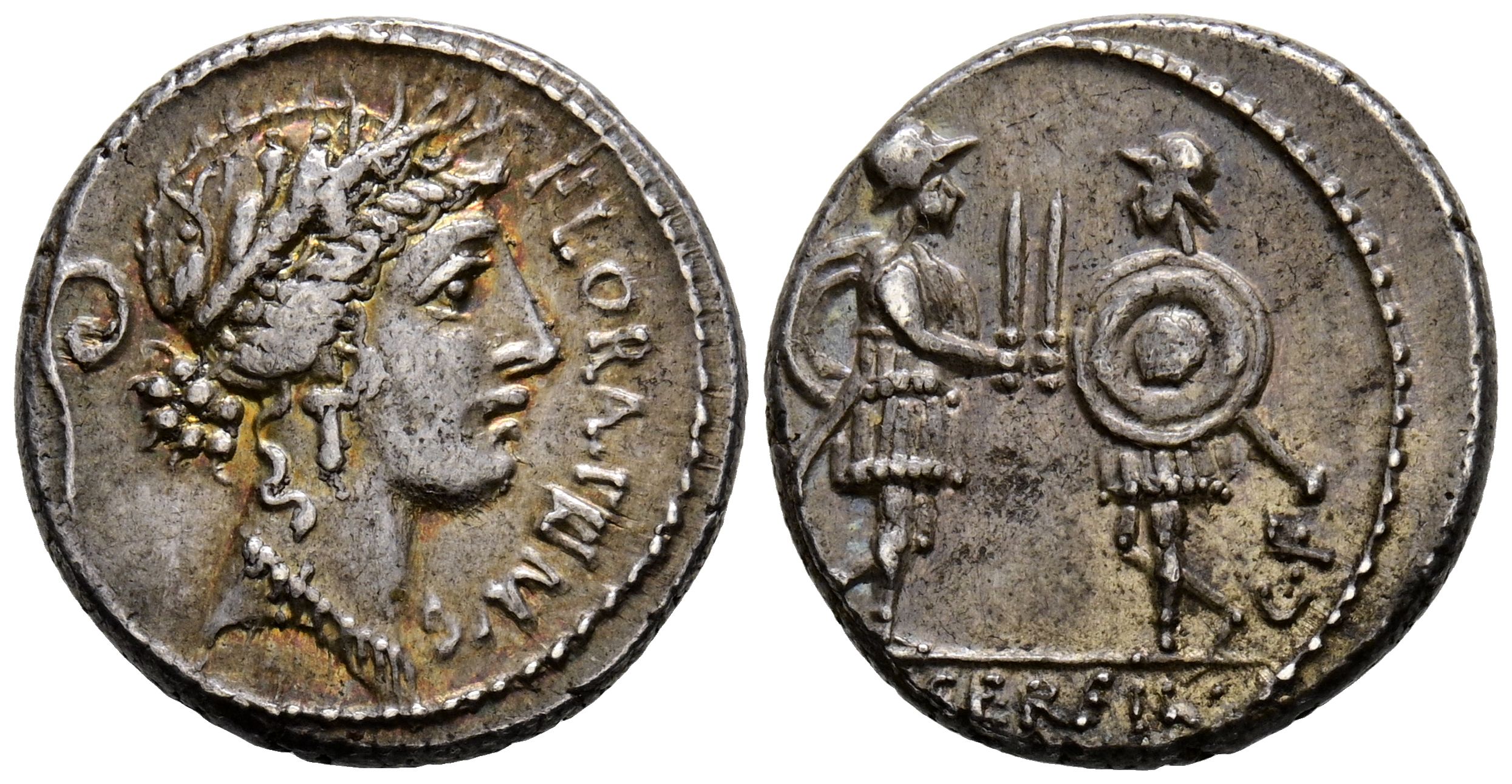 GENS SERVILIA. Denarius. (Ar. 4.08g/17mm). 57 BC Rome. (Crawford 423/1; FFC 1122). Anv: Flora's laureate head to the right, lituo behind, around legend: FLORAL PRIMVS. Rev: Two warriors facing each other with spears and shields, in field: CF, in exergue: C SERVEIL. Almost Extremely Fine. A rare Scarce like that.
