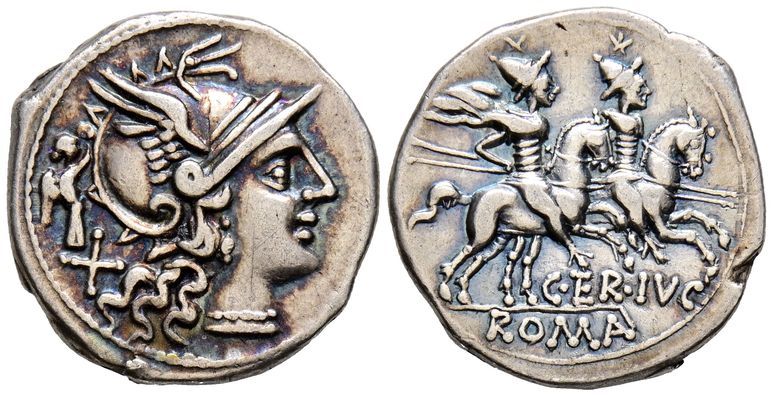 English GENS TERENTIA. Denarius. (Ar. 3.83g/19mm). 147 BC Rome. (Crawford 217/1; FFC 1140). Anv: Head of Rome with helmet to the right, behind X and Victory with a laurel wreath. Rev: Dioscuri on horseback to the right, above both stars, below legend: C TERLVC, in exergue: ROMA. Good Very Fine.