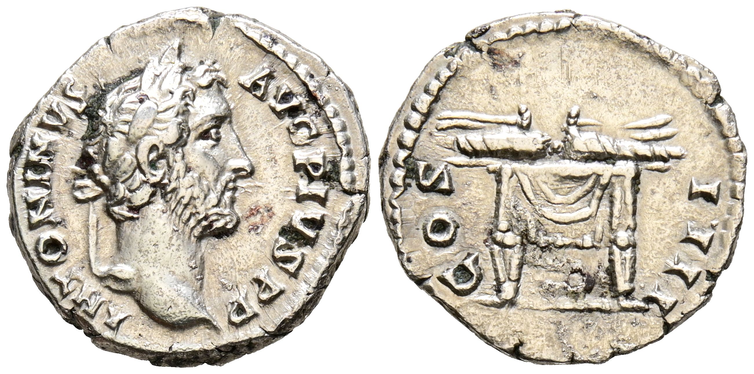 English ANTONINO PIO. Denarius. (Ar. 3.00g/17mm). 145-161 AD Rome. (RIC 137). Anv: Laureate head of Antoninus Pius to right, around legend: ANTONINVS AVG PIVS P P. Rev: Winged ray on draped altar, around legend: COS IIII. Good Very Fine. Cleaned.