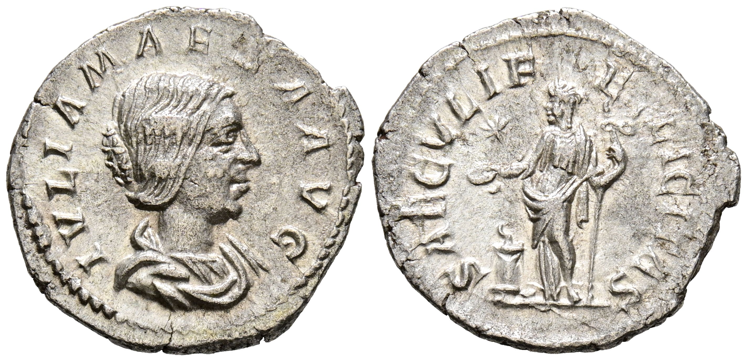 JULIA MAESA. Denarius. (Ar. 2.10g/20mm). 218-222 AD Rome. (RIC 272). Anv: Draped bust of Julia Maesa to the right, around legend: IVLIA MAESA AVG. Rev: Felicitas standing on the left carrying a caduceus on the altar and caduceus, in the star field, around the legend: SAECVLI FELICITAS. Good Very Fine.