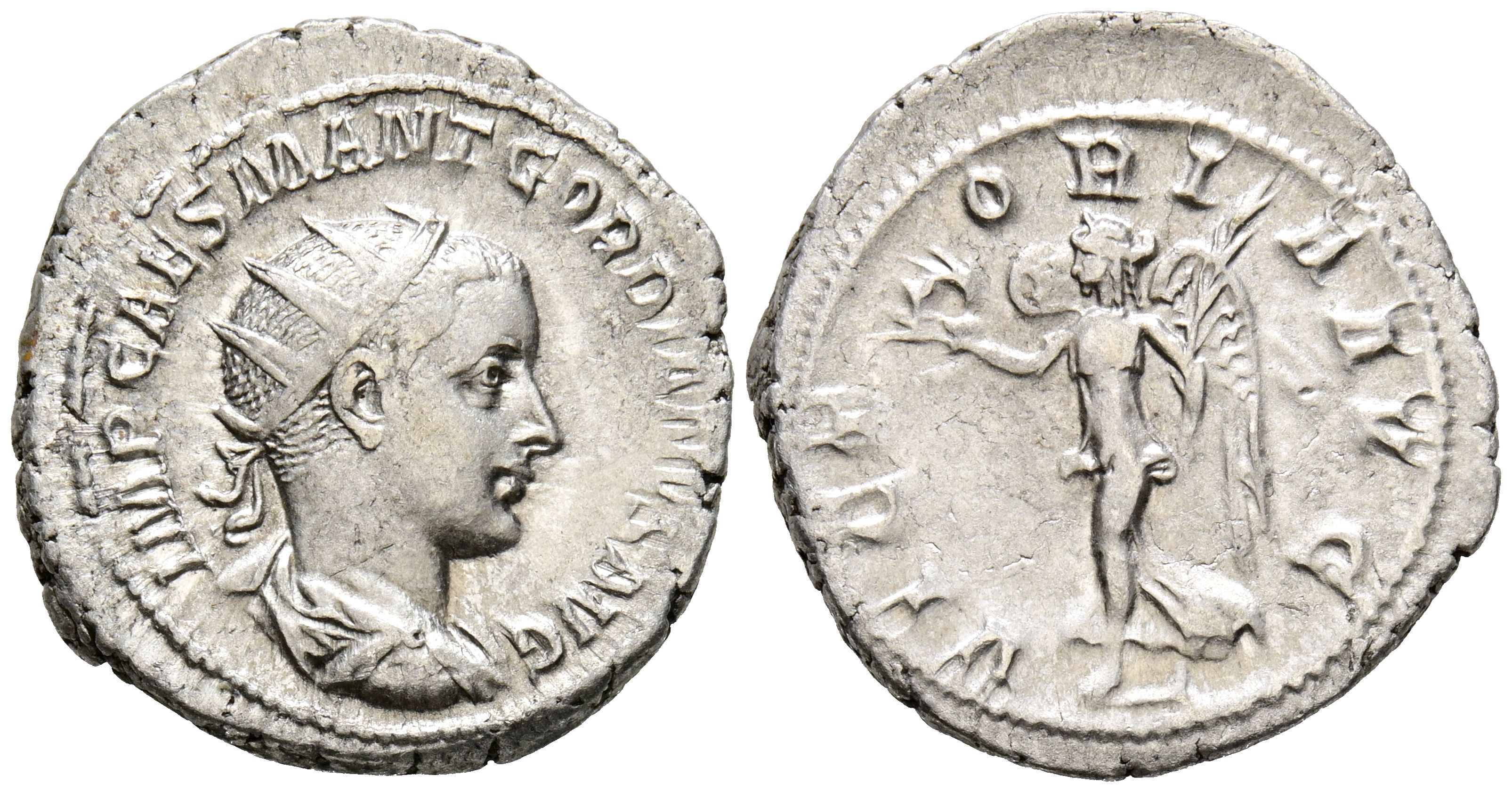 GORDIAN III. Antoninian. (Ar. 5.35g/23mm). 238-239 AD Rome. (RIC 5). Anv: Radiated and draped bust with cuirass of Gordian III to the right, around legend: IMP CAES M ANT GORDIANVS AVG. Rev: Victoria advancing to the left carrying a laurel wreath, around legend: VICTORIA AVG. Very Fine.